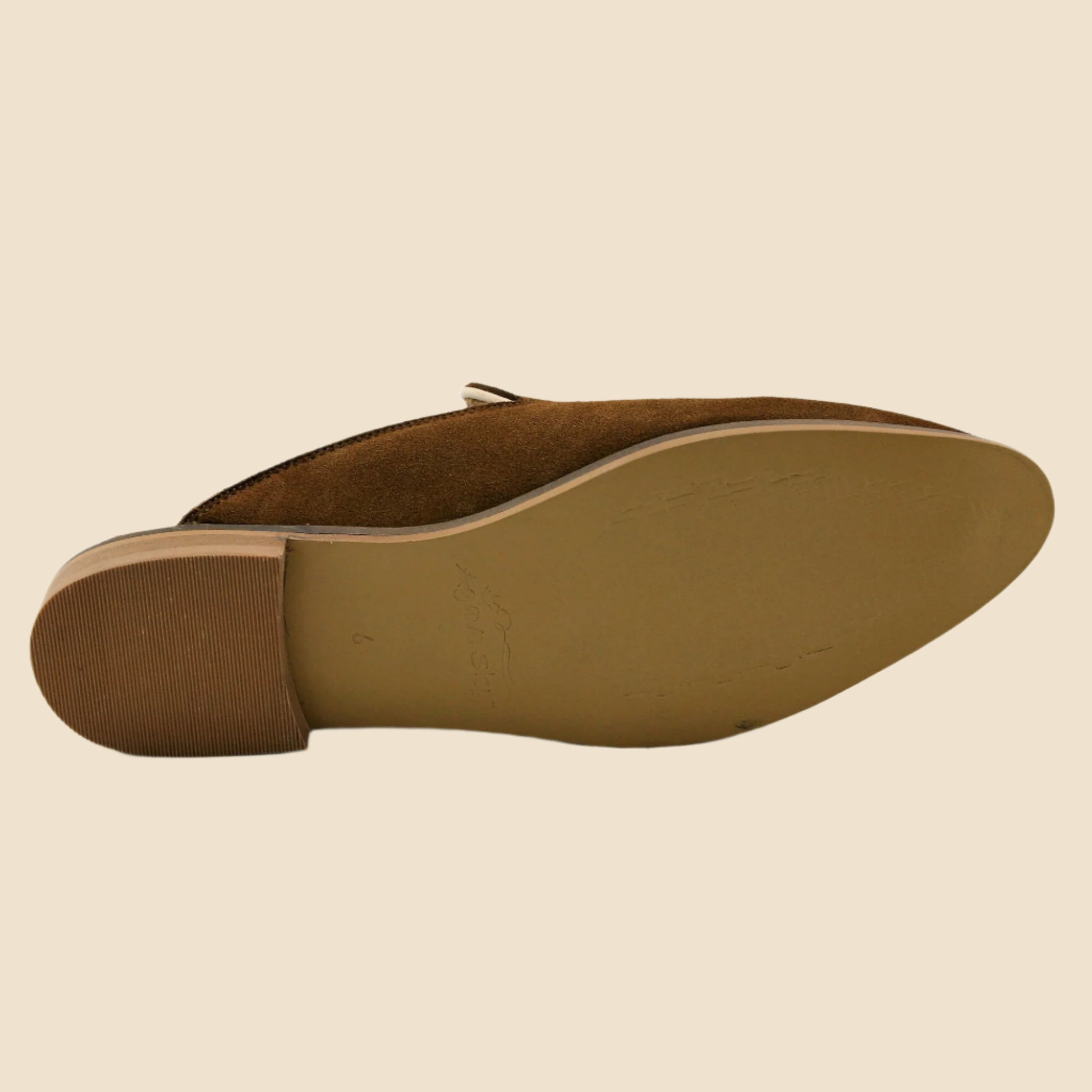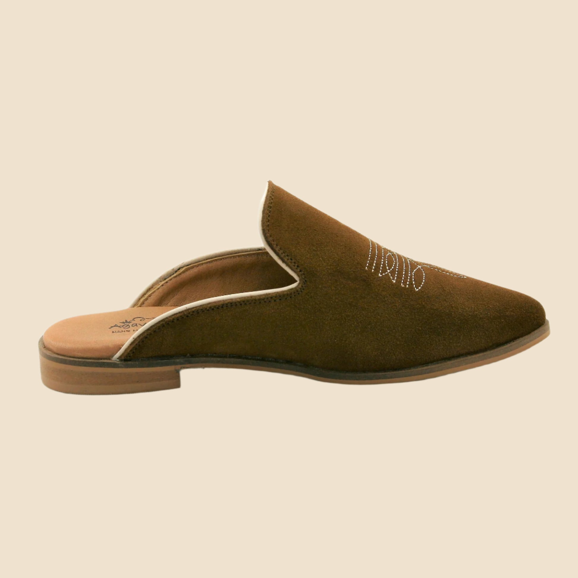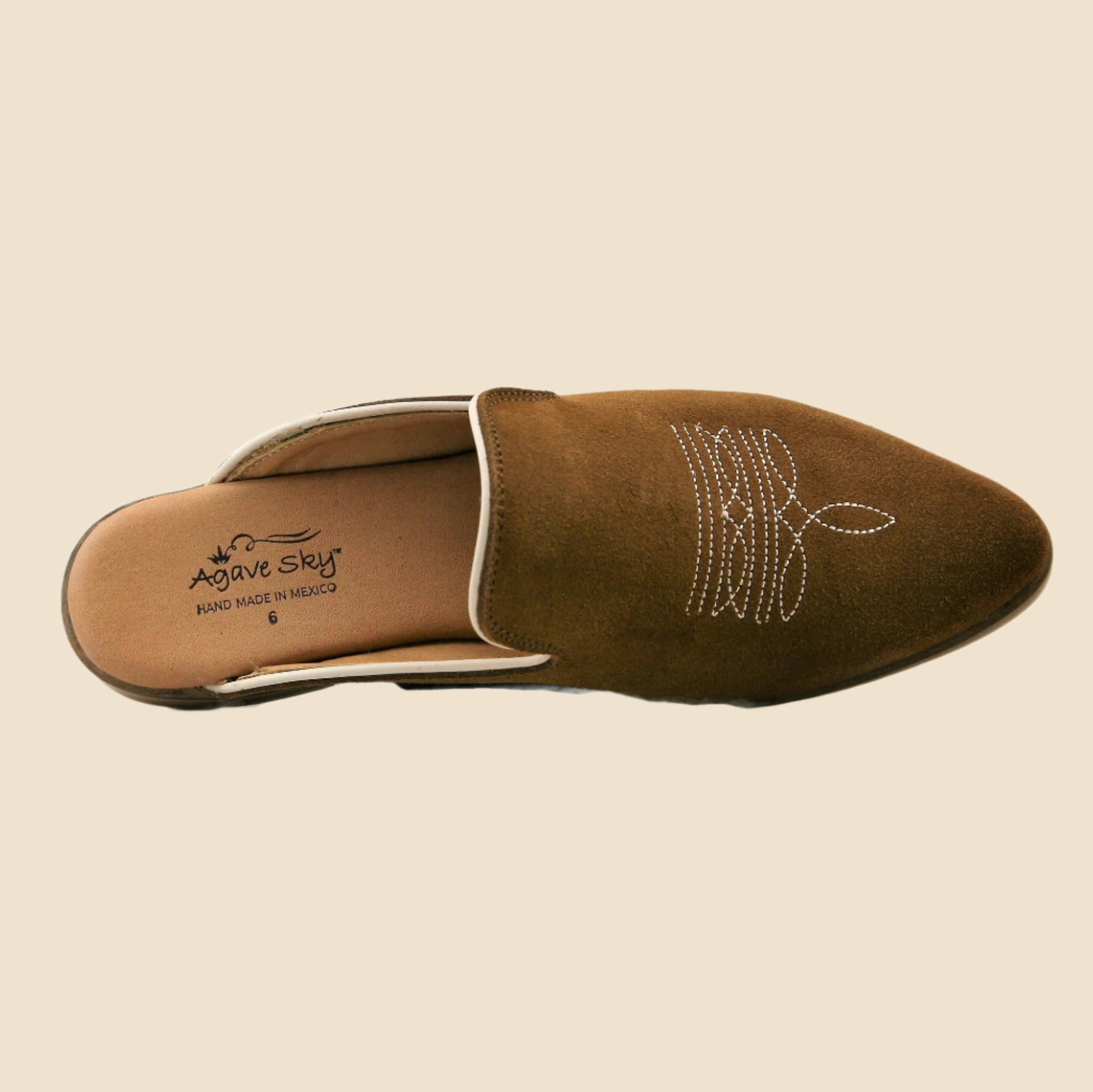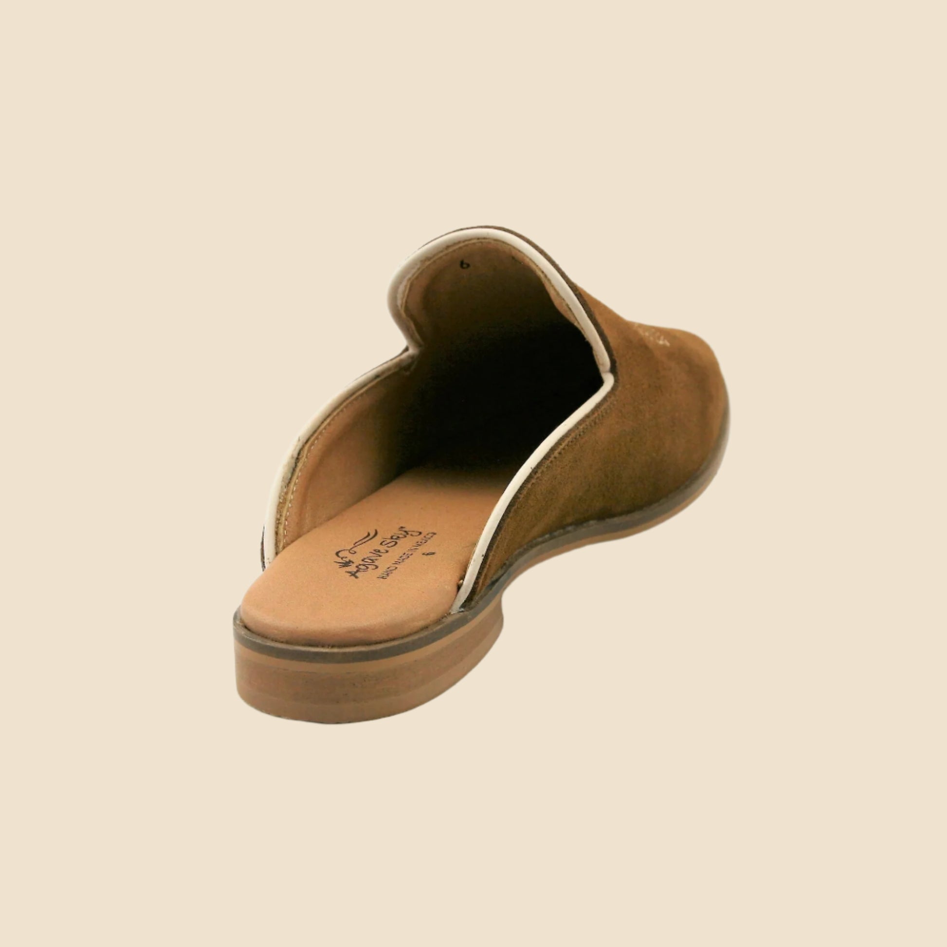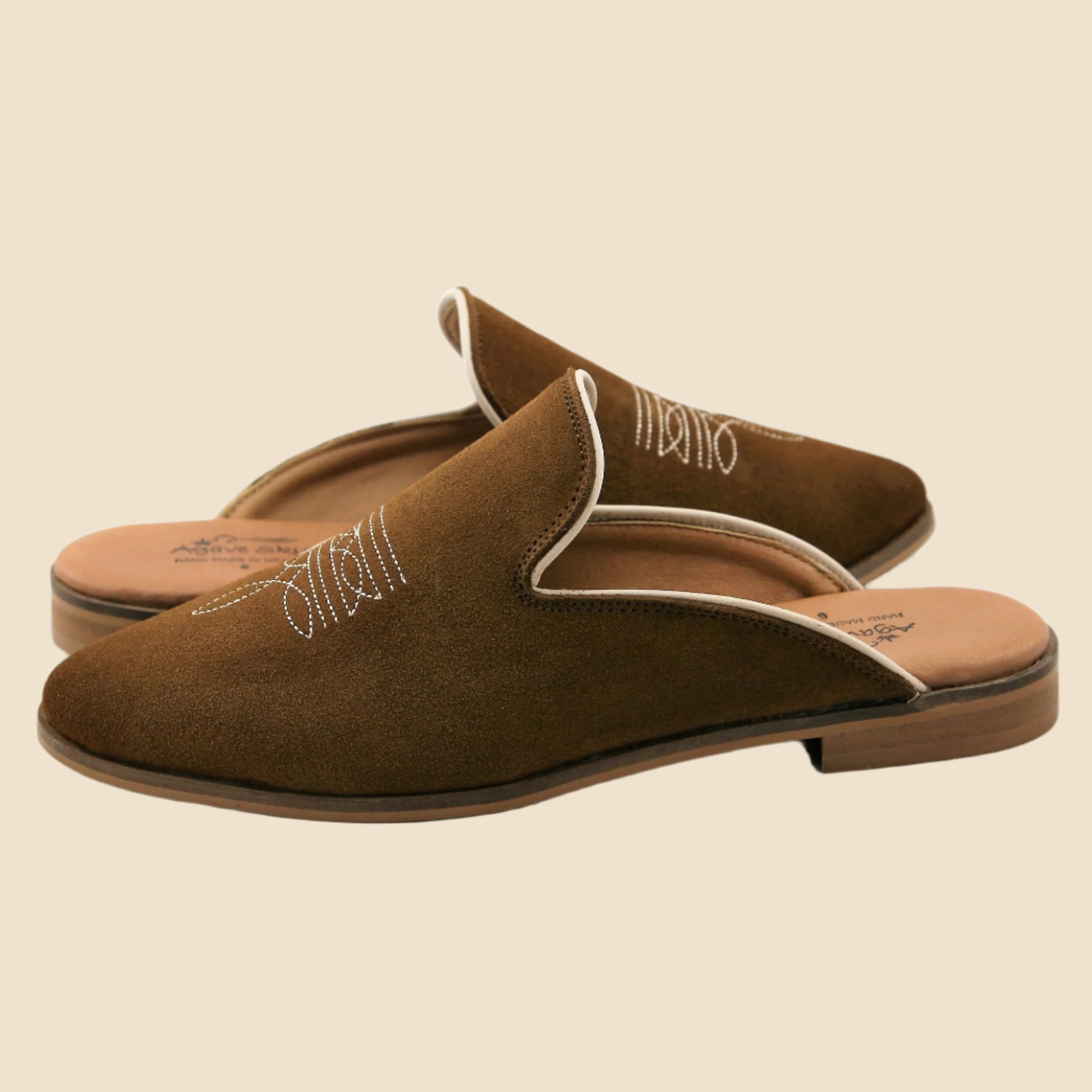 This Adaire mule features the iconic western boot stitch combined with honey rough out suede and cream contrasting piping in a slide on silhouette. Leather padding on the insole and the perfect little non slip heel and you're comfort level just kicked into high gear.