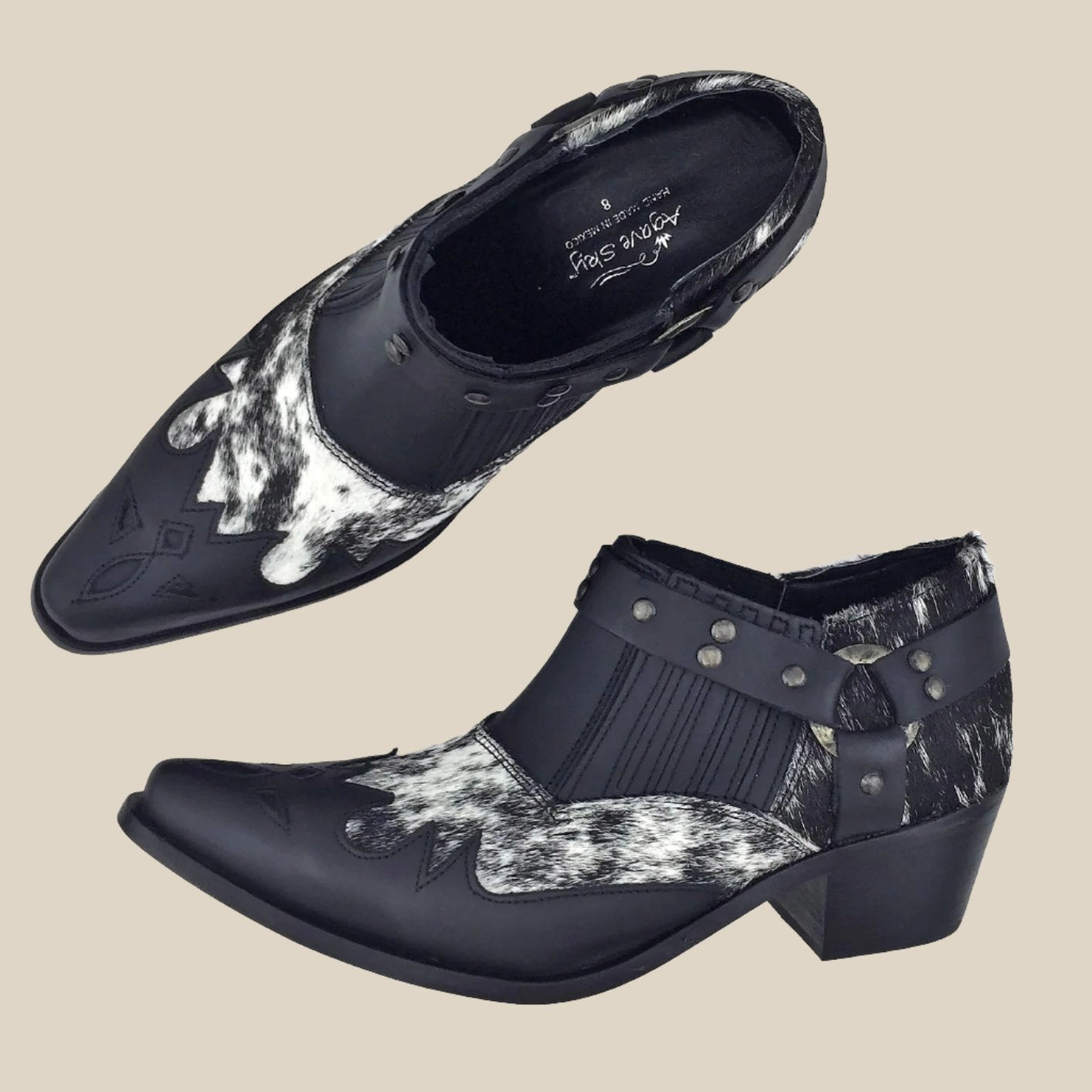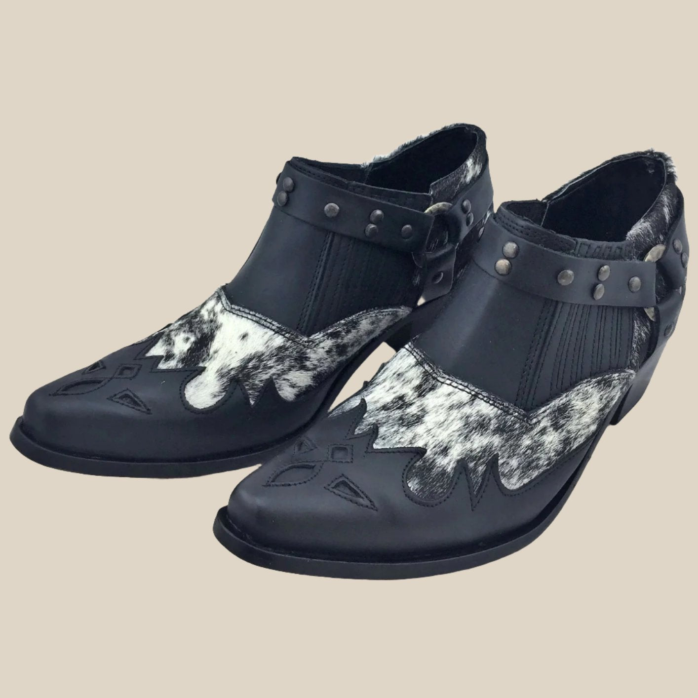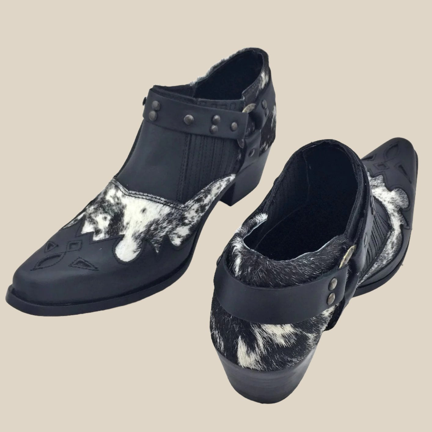 Look your best wearing our super stylish Gigi's. Adorned with authentic black and white cowhide, black leather trim and elastic comfort fit around your ankle. With a 2" heel and pure leather sole with cushioned insole