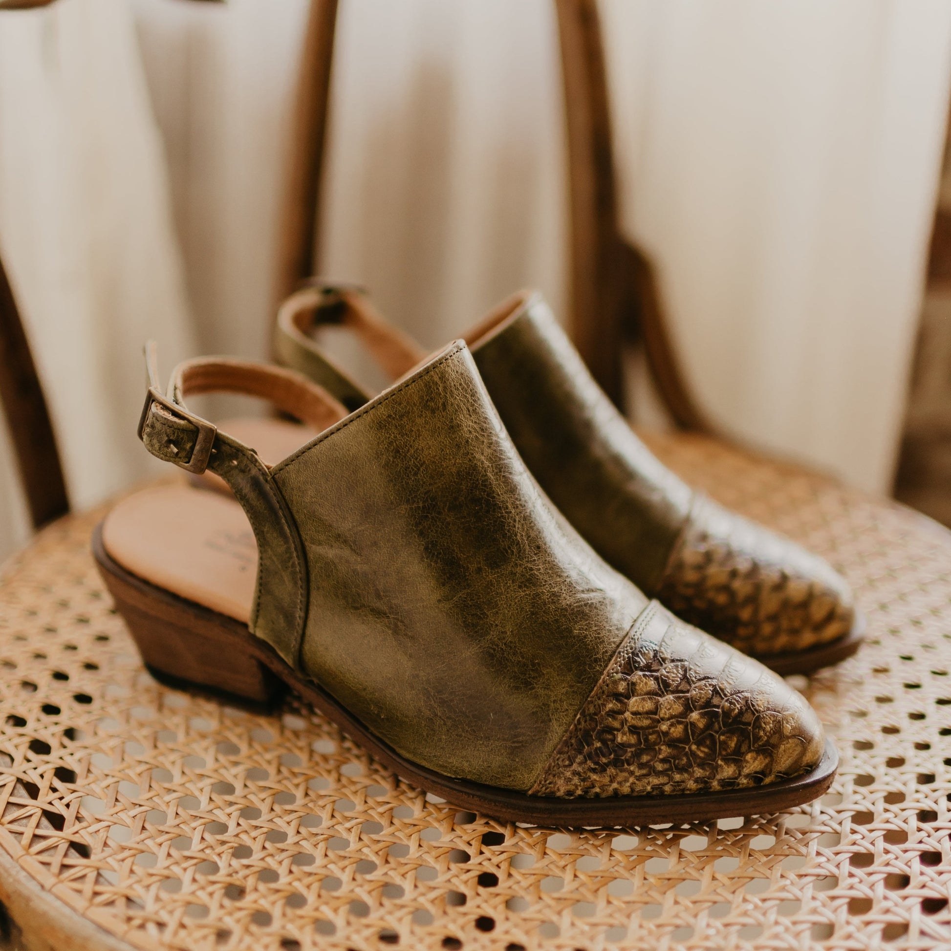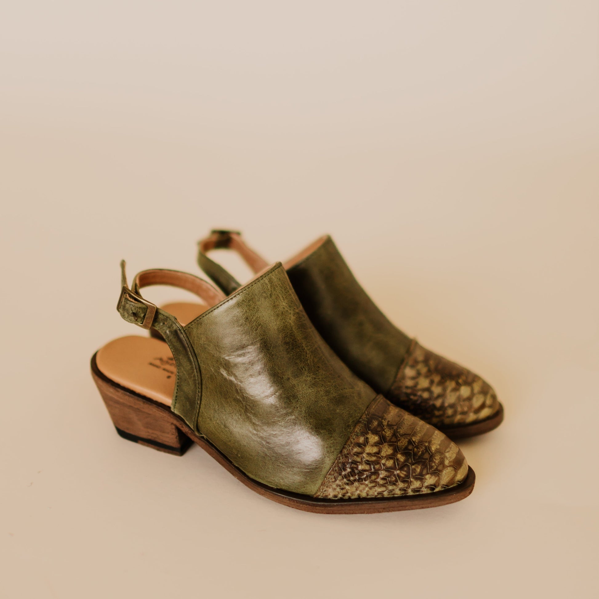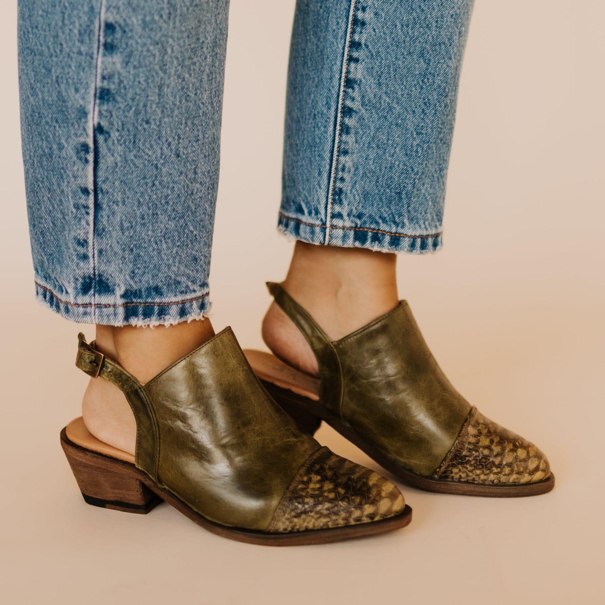 Nothing offers versatility like our Sarah mule. This mule features full-grain leather upper with a decorative python print toe and an adjustable ankle strap.