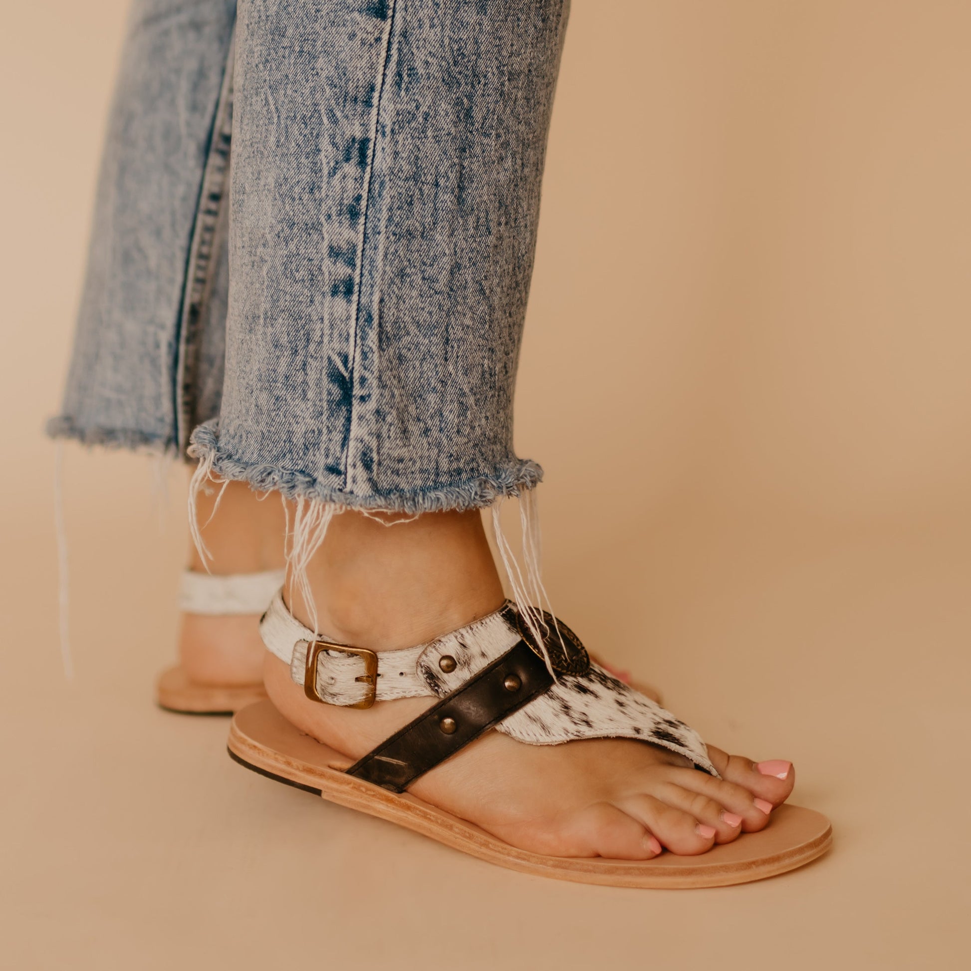 Our Connie cowhide Salt & Pepper sandals are hand cut from 100% natural cowhide and have ankle strap with a concho decoration