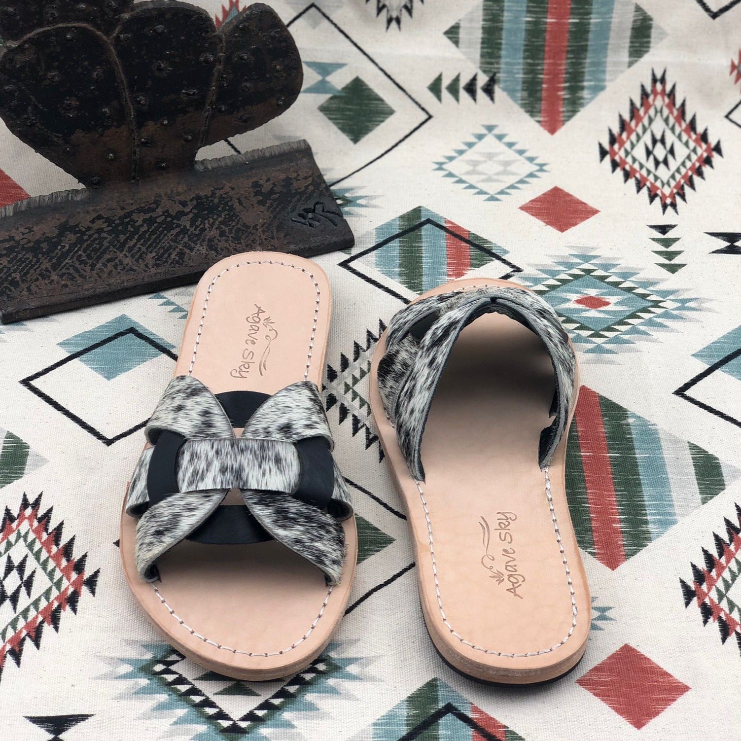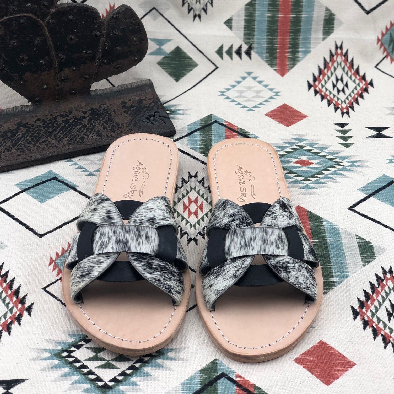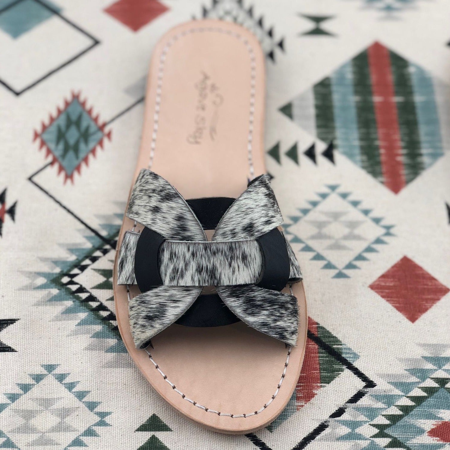 Find a new go-to with our new Olivia slides. Featuring authentic cowhide and black leather on a 100% leather sole, these slides are the perfect addition to your summer wardrobe.