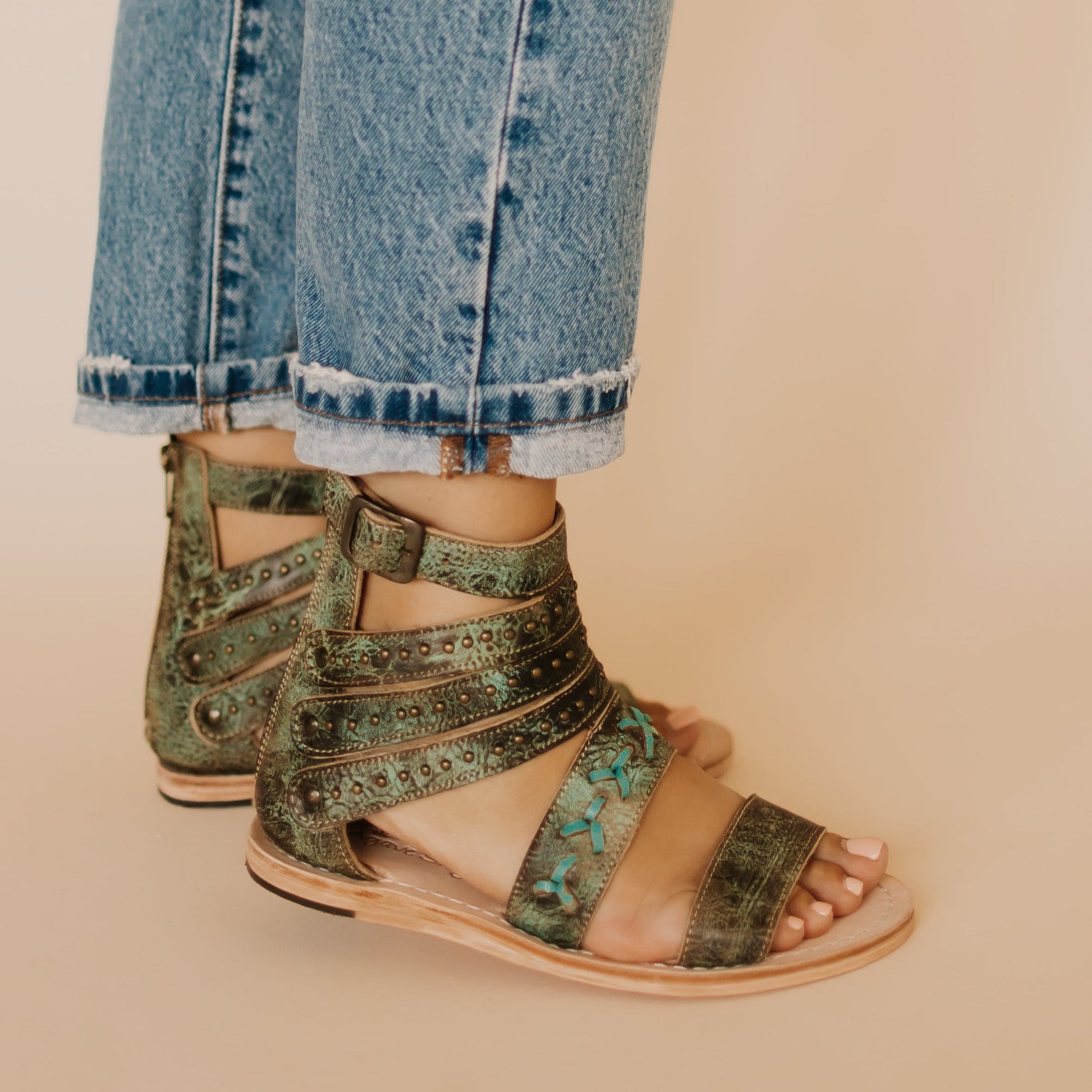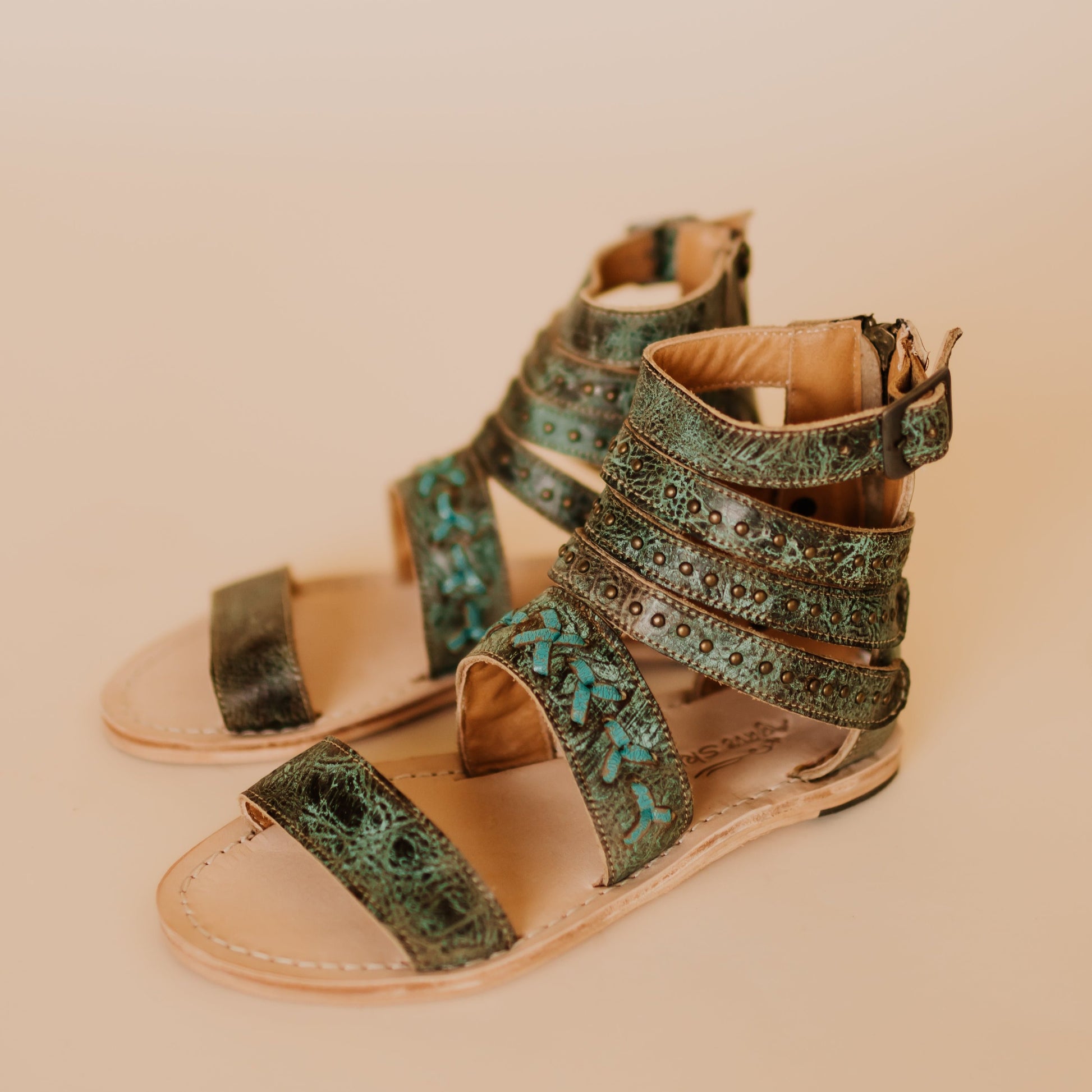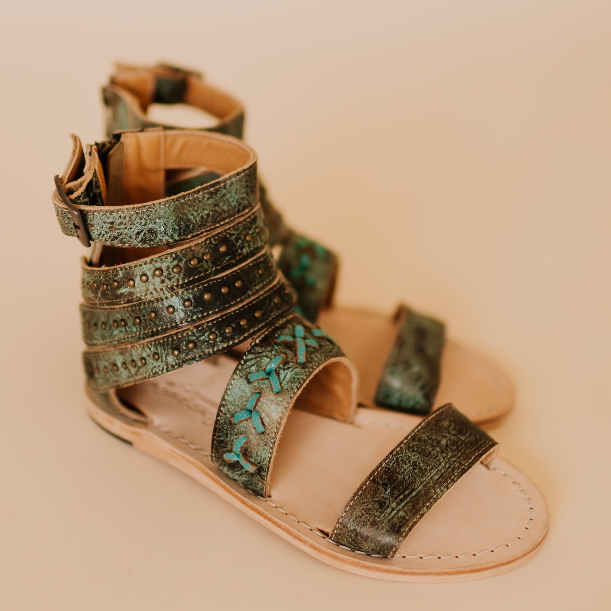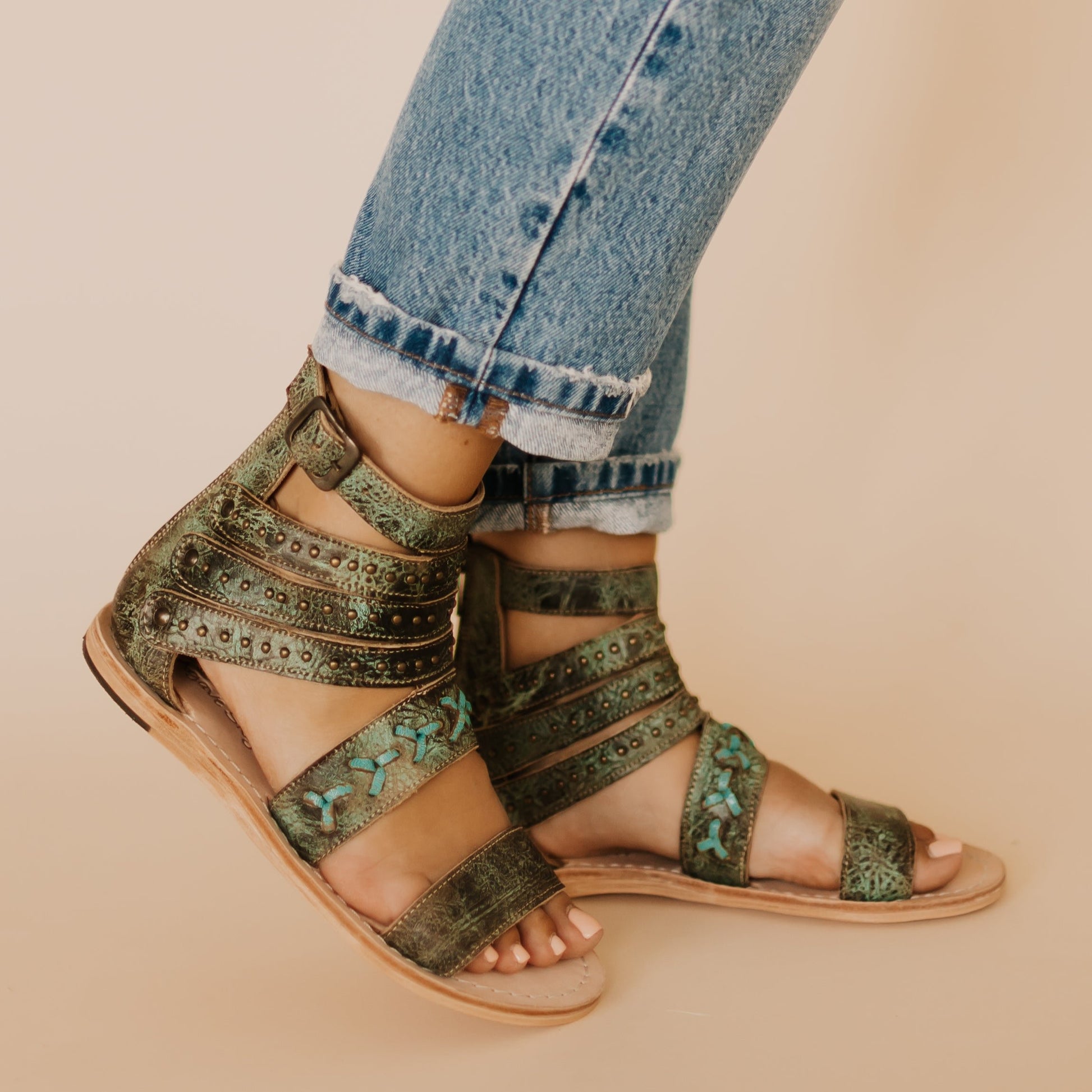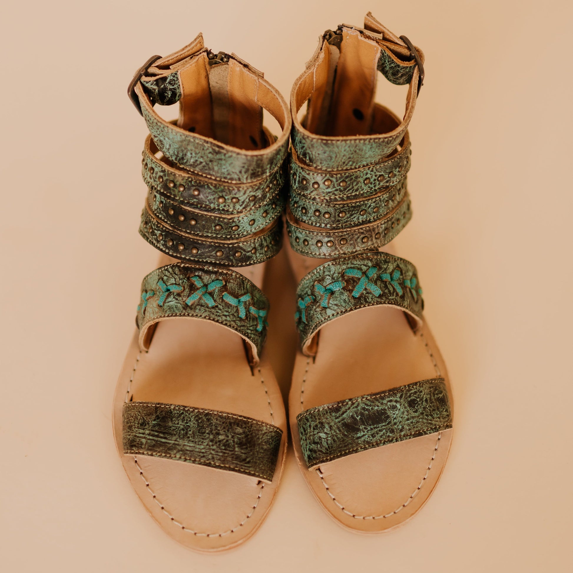 Our Gabriella Grecian style sandal in turquoise has a genuine leather upper with topstitching and studded details. Easy to put on with a back zipper closure and adjustable ankle strap, you are ready to rule the summer in this boho-chic style.