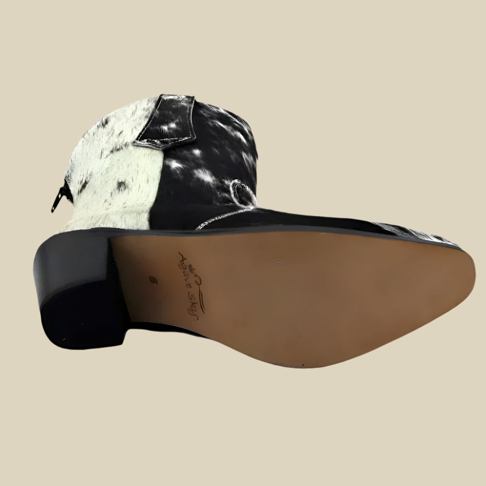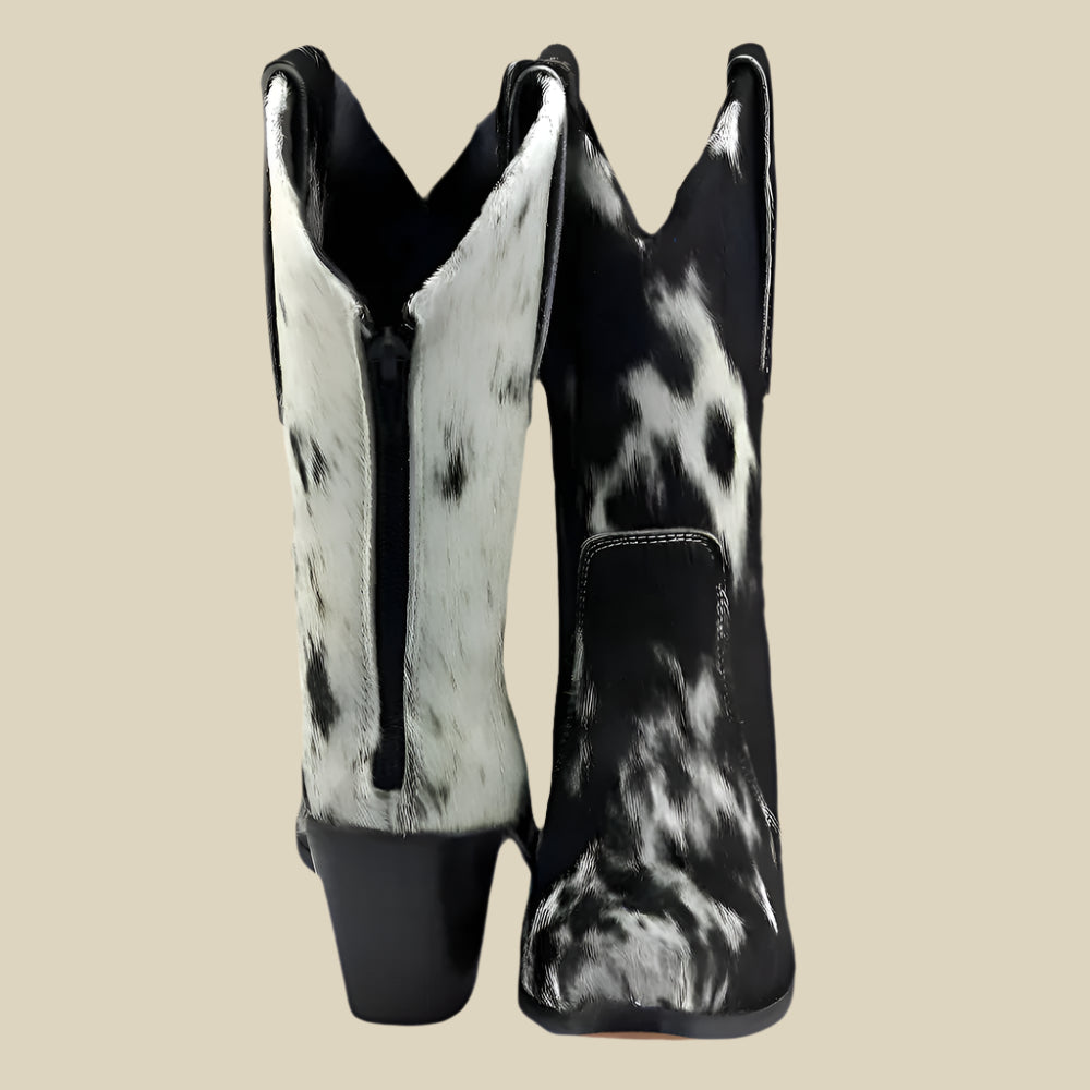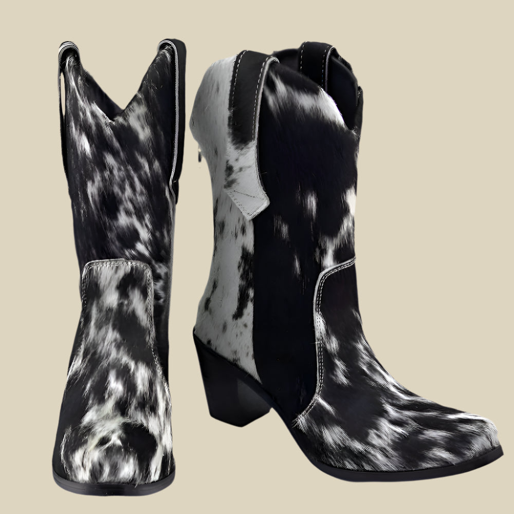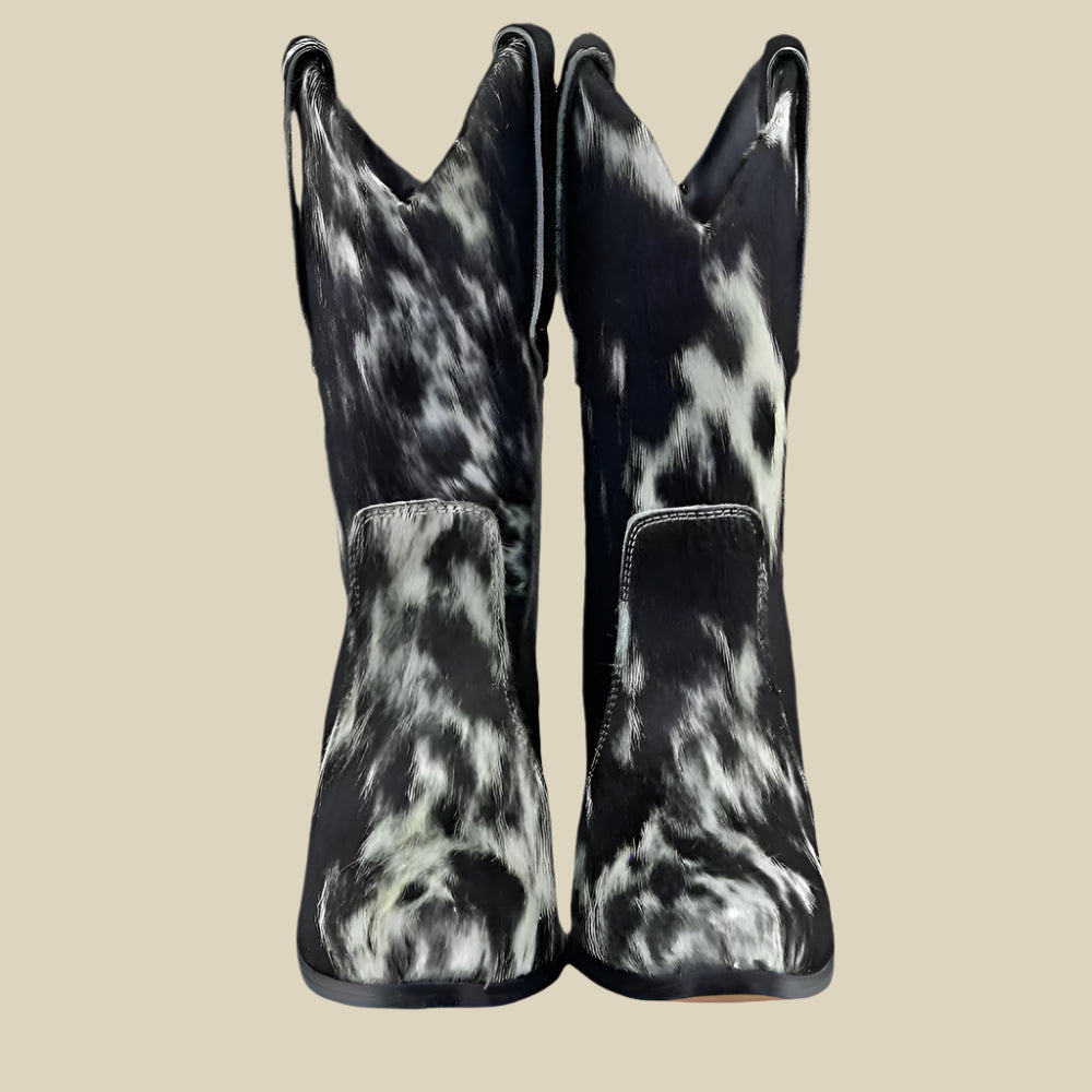 Finish your outfit with the unique look of these stylish cowhide boots. Featuring authentic cowhide and a back zipper, these boots add a touch of modernity to a classic design. Our cowhide mid calf is designed to fit the wide calf or slim calf and will definitely turn heads.