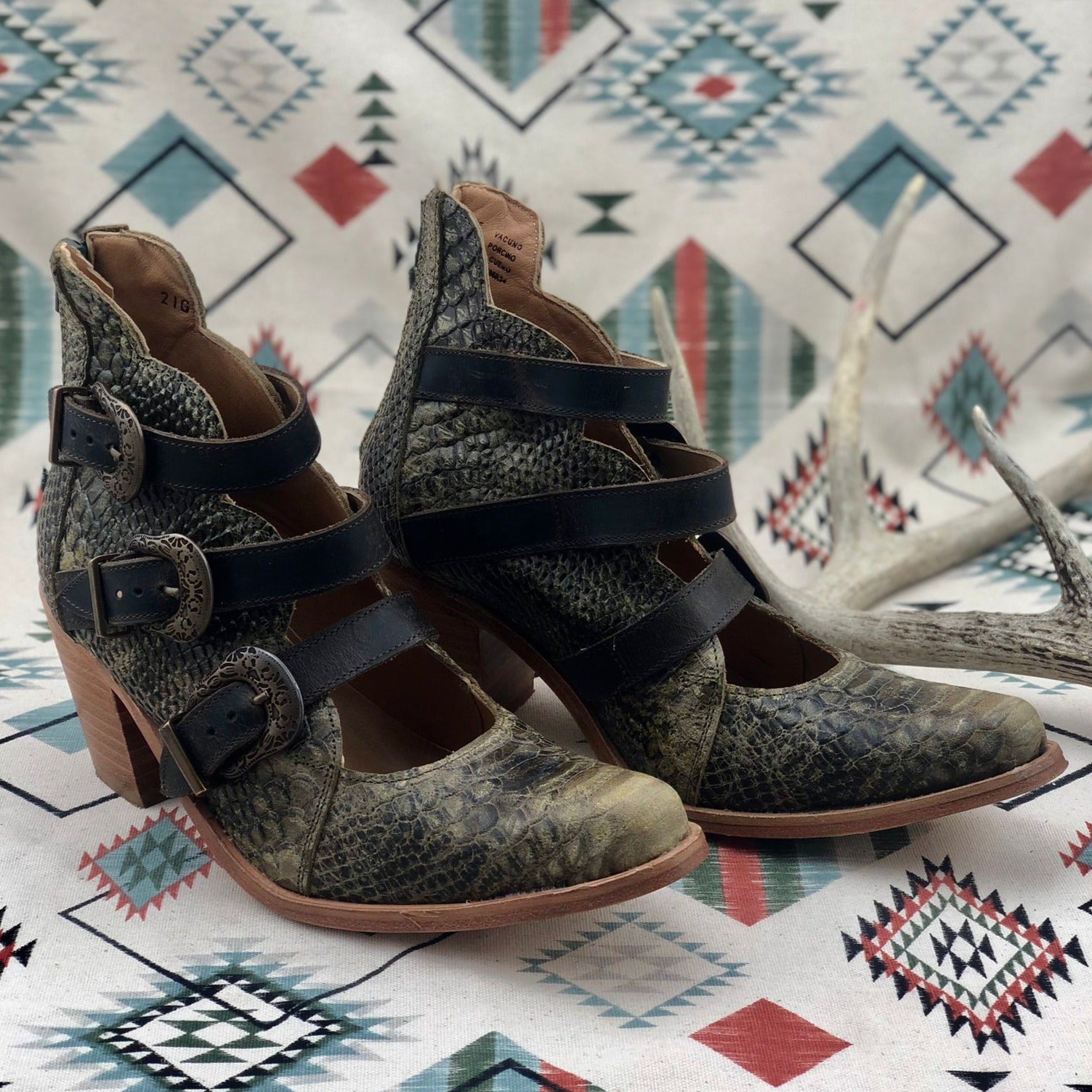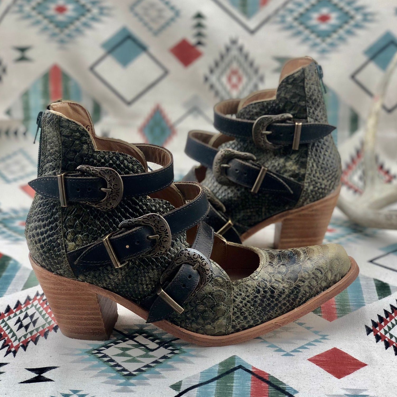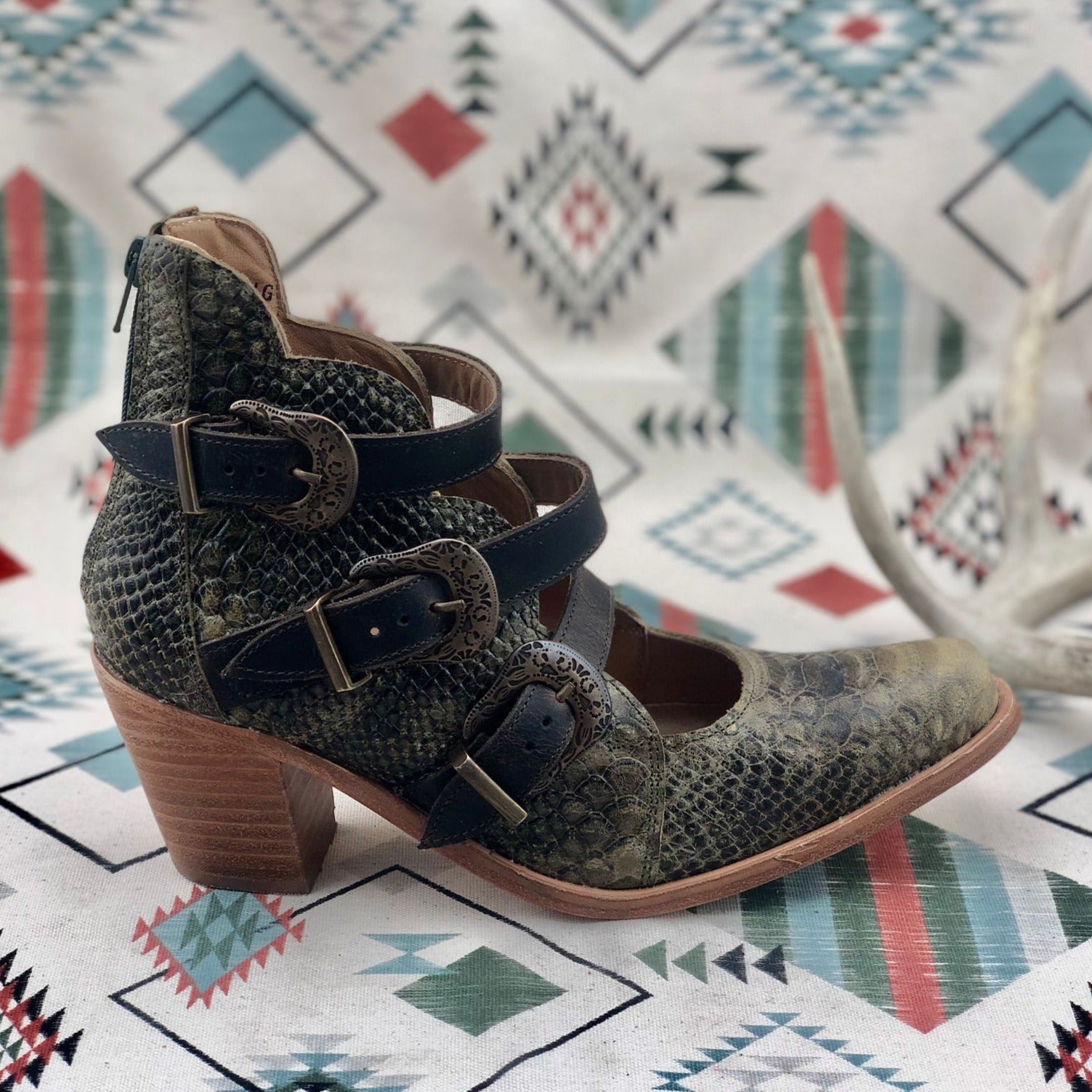 Elevate your style in our Georgia Buckles booties. Hand crafted from faux python leather, they boast our three-buckle, scalloped design. Theses pull on style booties have a back zipper closure for a secure fit. The padded leather insole is supreme and makes these boots perfect to wear from morning till dusk.