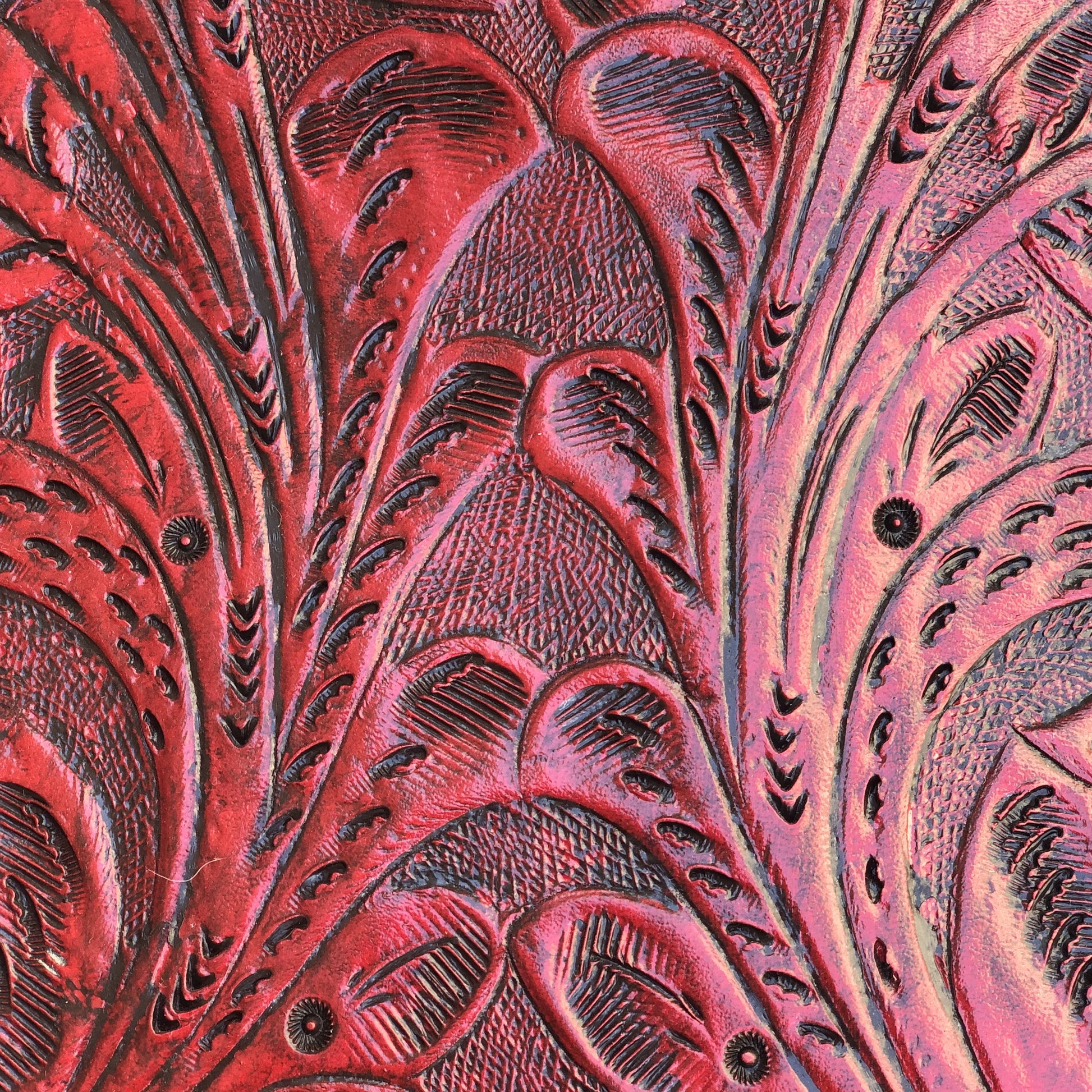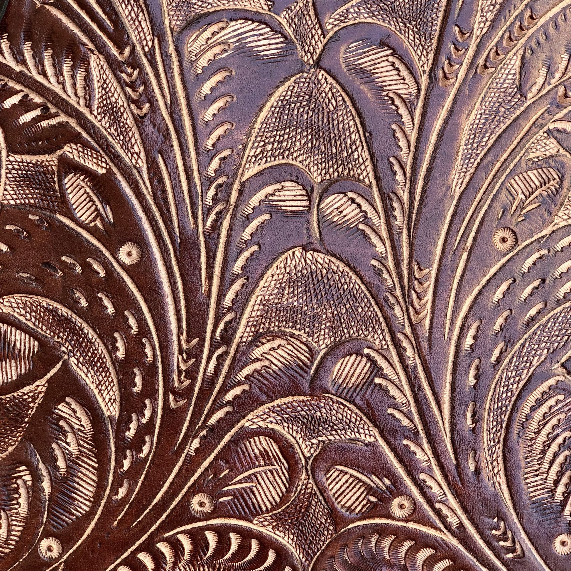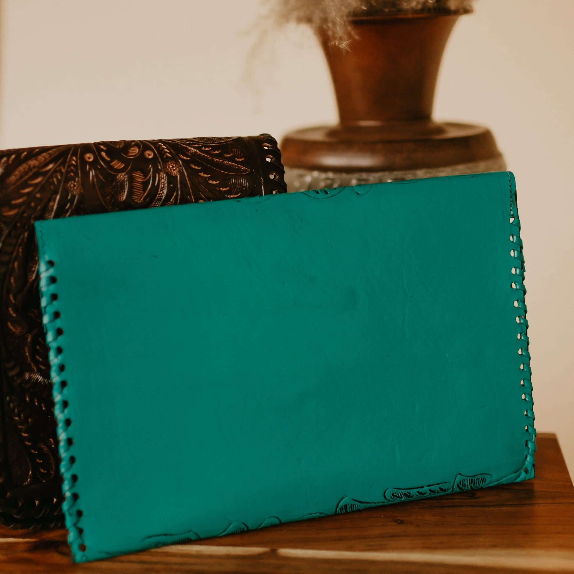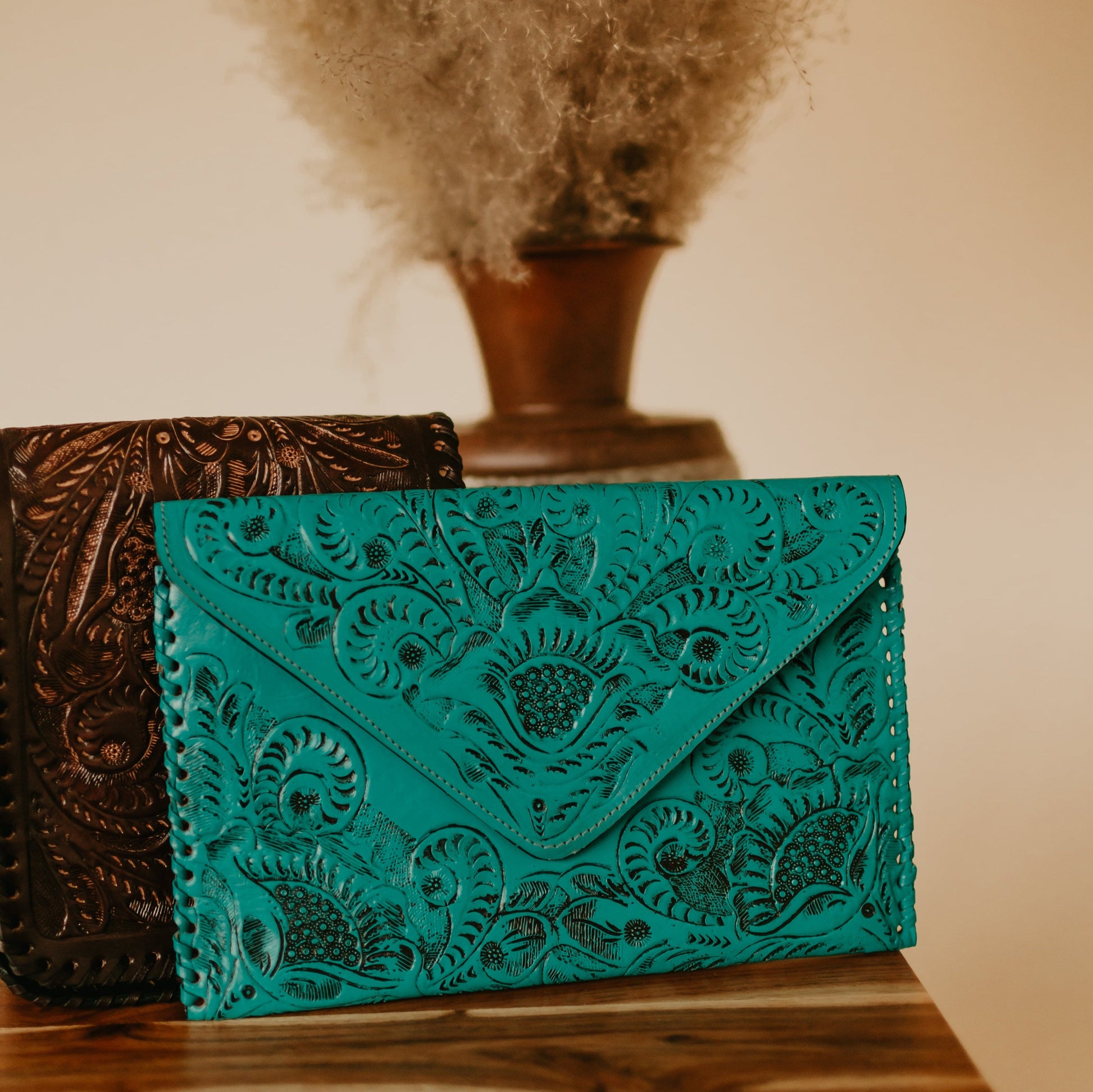 Our hand tooled Envelope clutch is made with full-grain leather and a hand tooled design on one side of the bag. With a spacious interior and one slip pocket inside, it is a great little clutch for a night on the town.