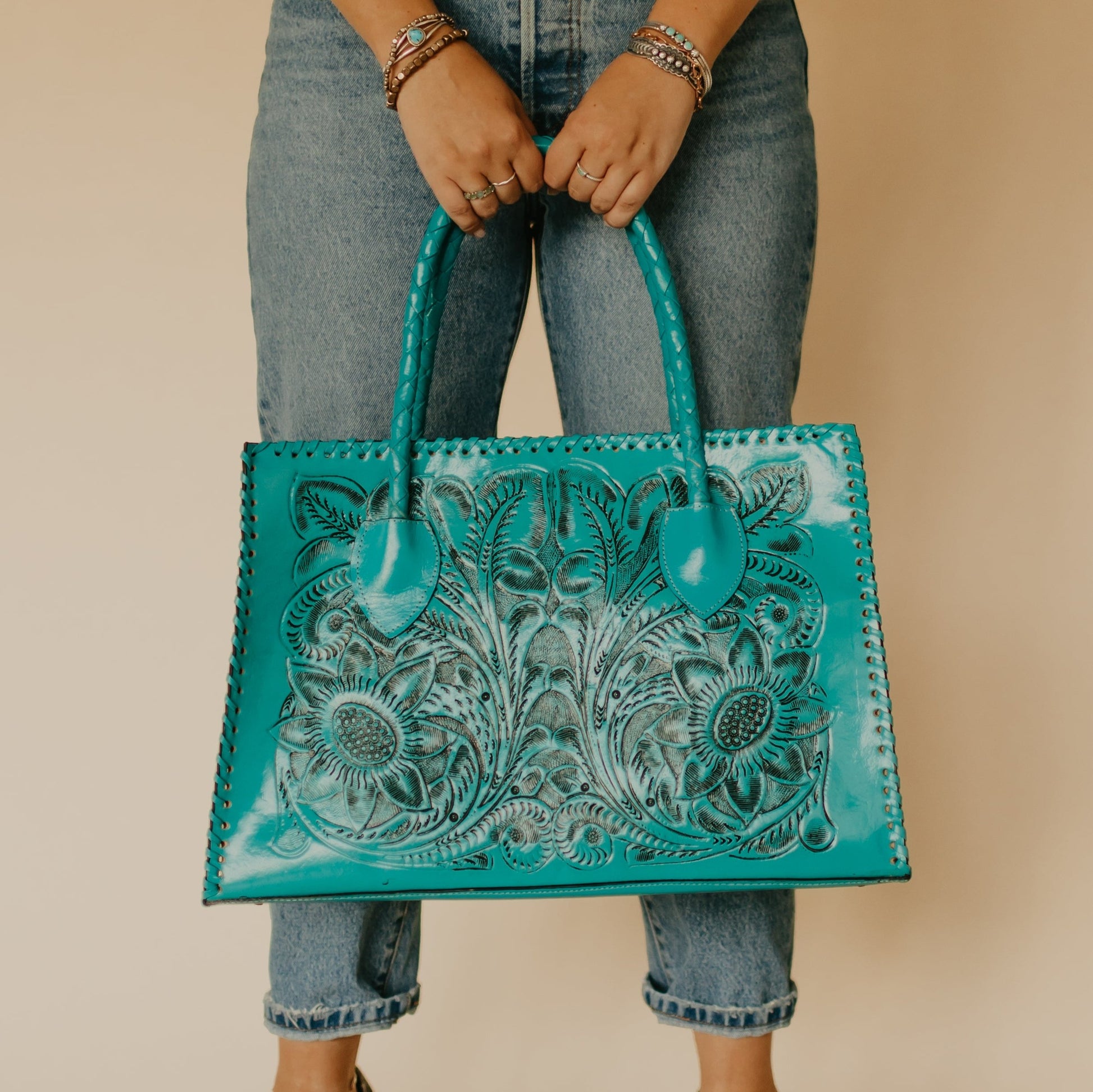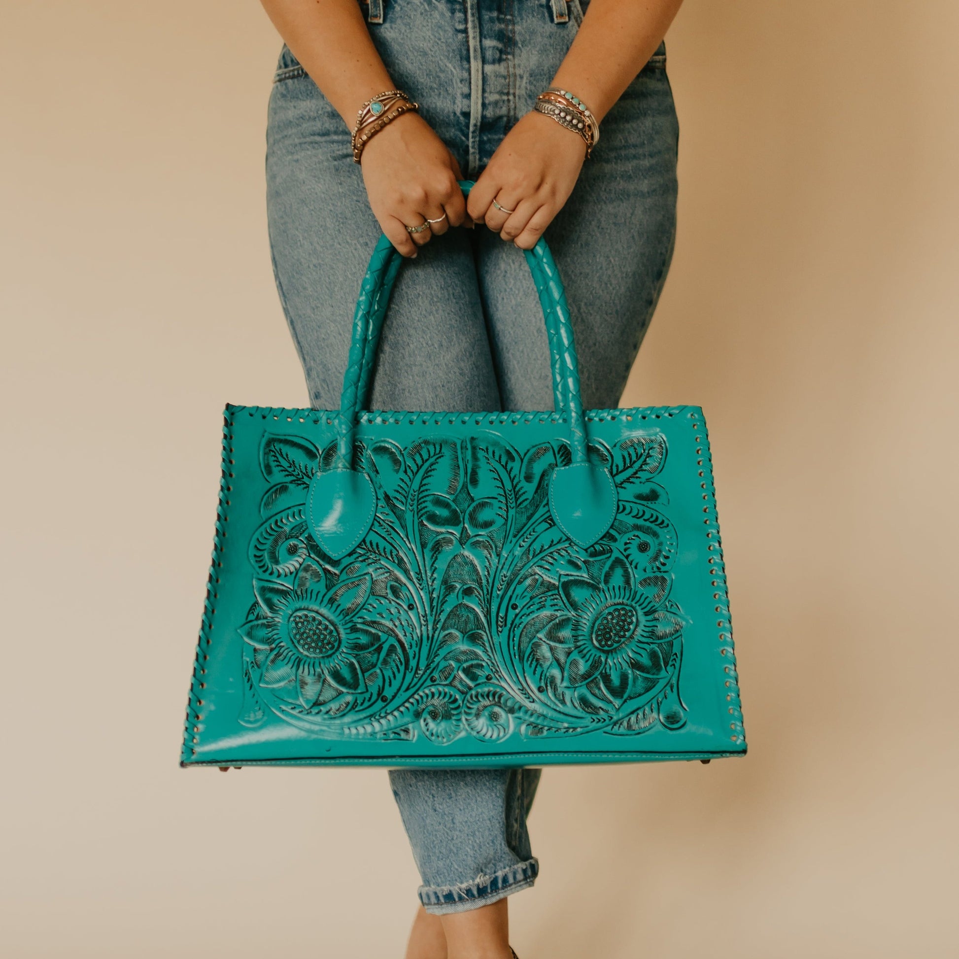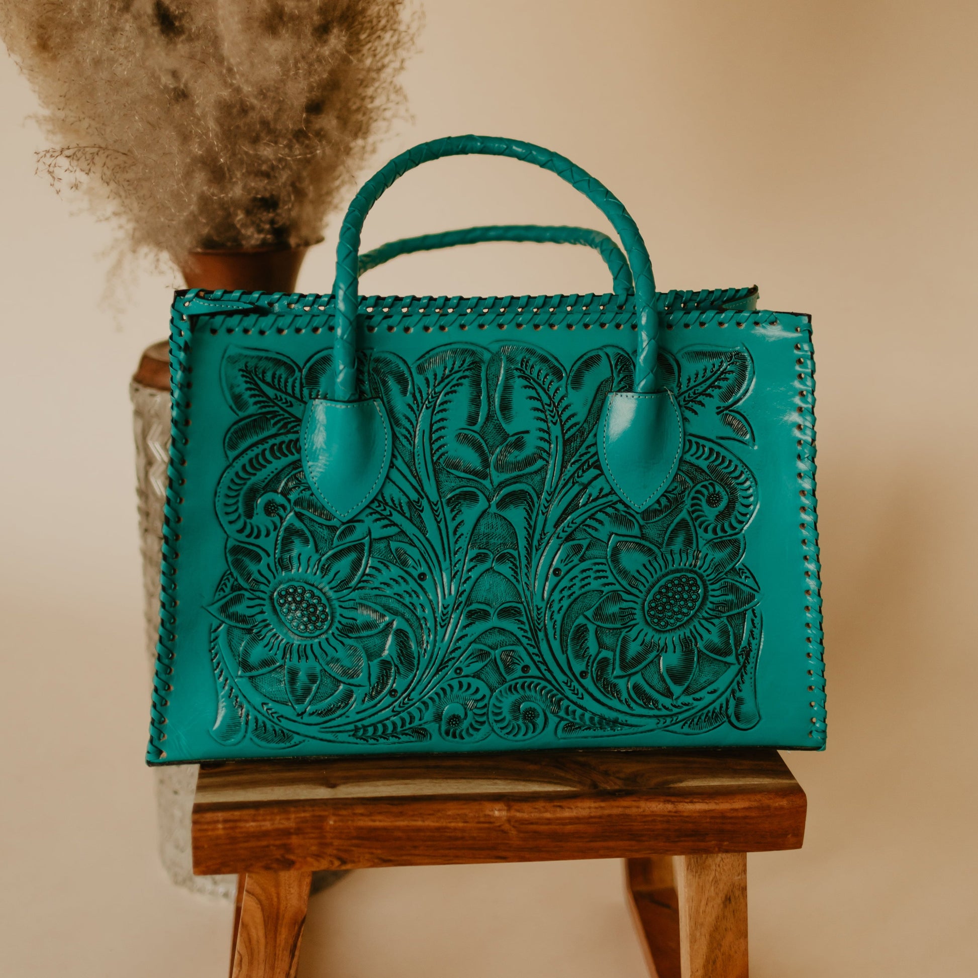 Our hand tooled leather tote is made with full-grain leather and a hand tooled design on both sides of the bag, featuring whip stitching on the sides. With a spacious interior and thoughtfully placed pockets , our tote is your ultimate travel companion. Interior has one zip pocket and one slip pocket. Rope design handles drop 7" from shoulder.