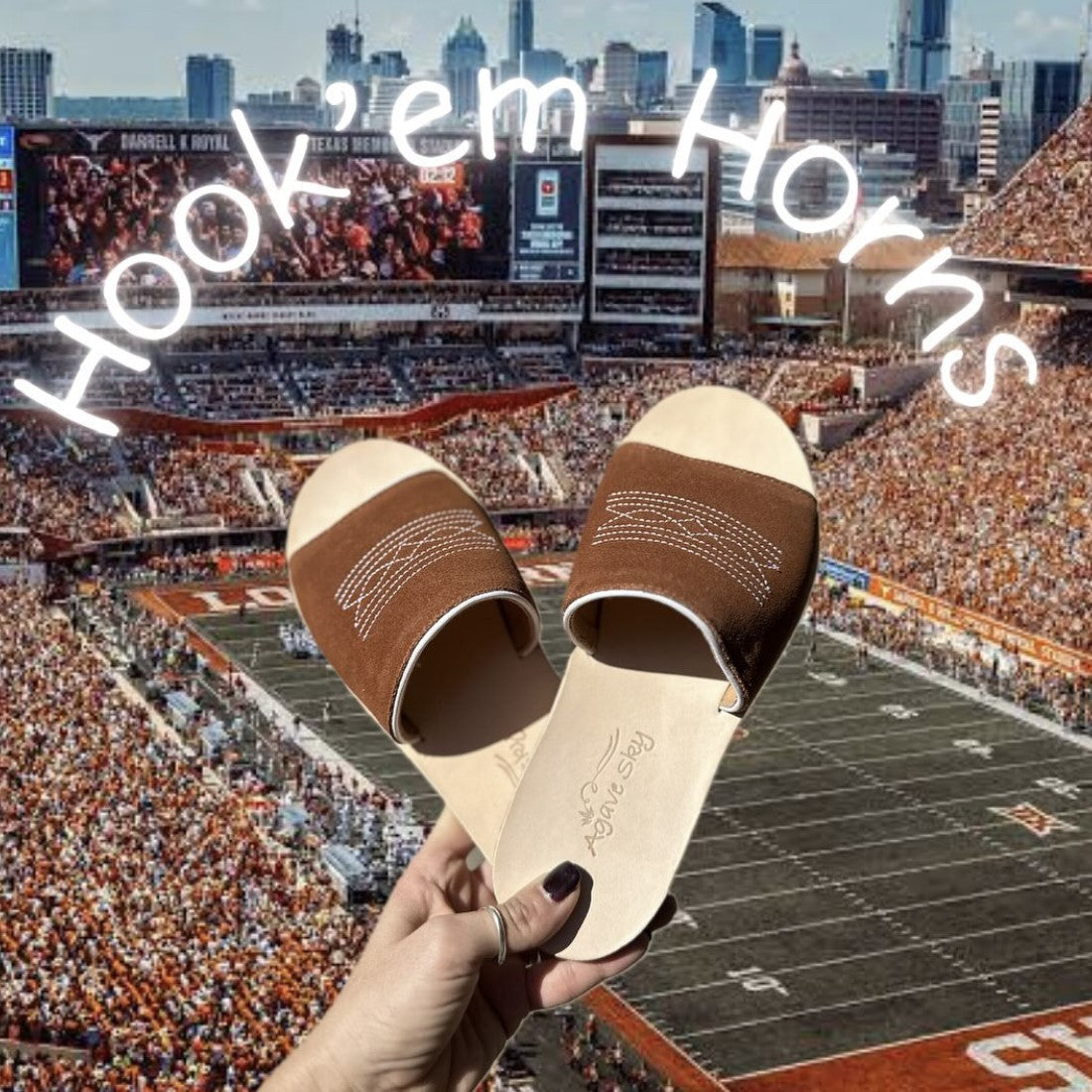 We've combined rust roughout suede with boot stitch embroidery and white piping accent to create the perfect slide for the modern western woman. Handmade leather soles.