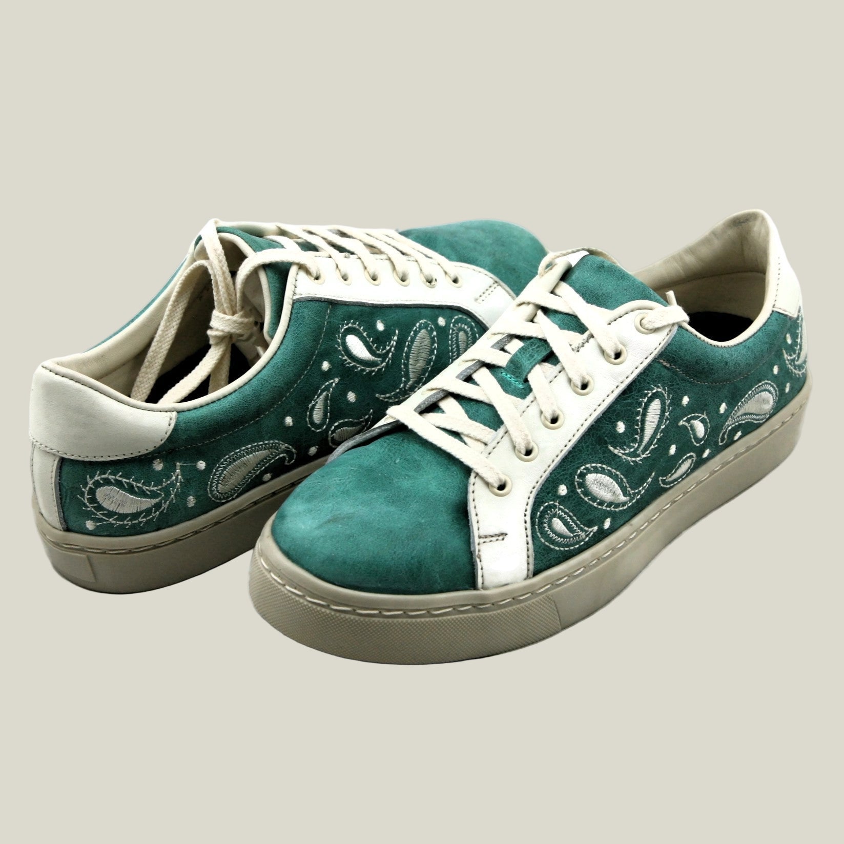 Our Paisley Tennis is the perfect casual tennis shoe for everyday wear. Featuring turquoise leather upper with embroidered detailing, it has just the perfect amount of western flare.