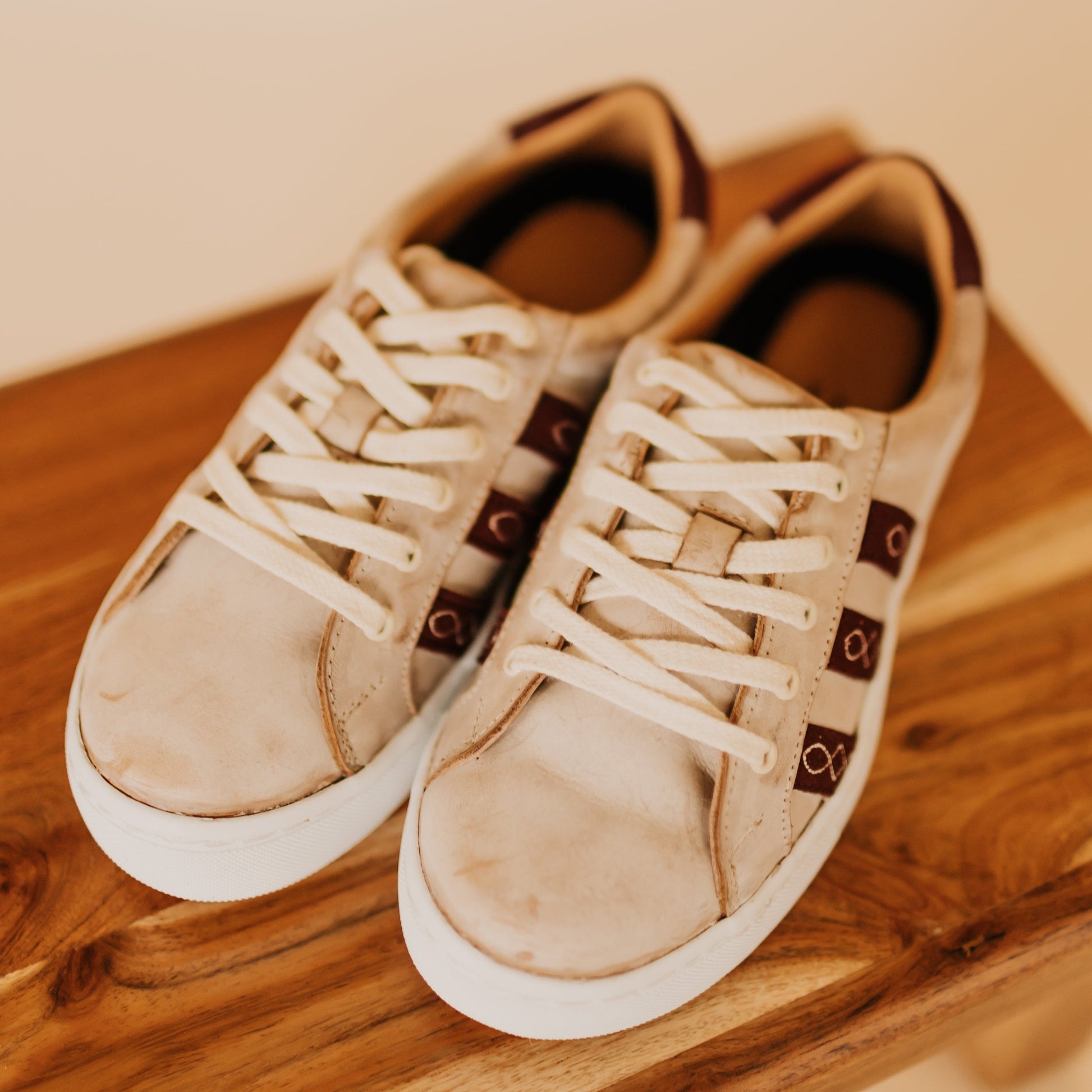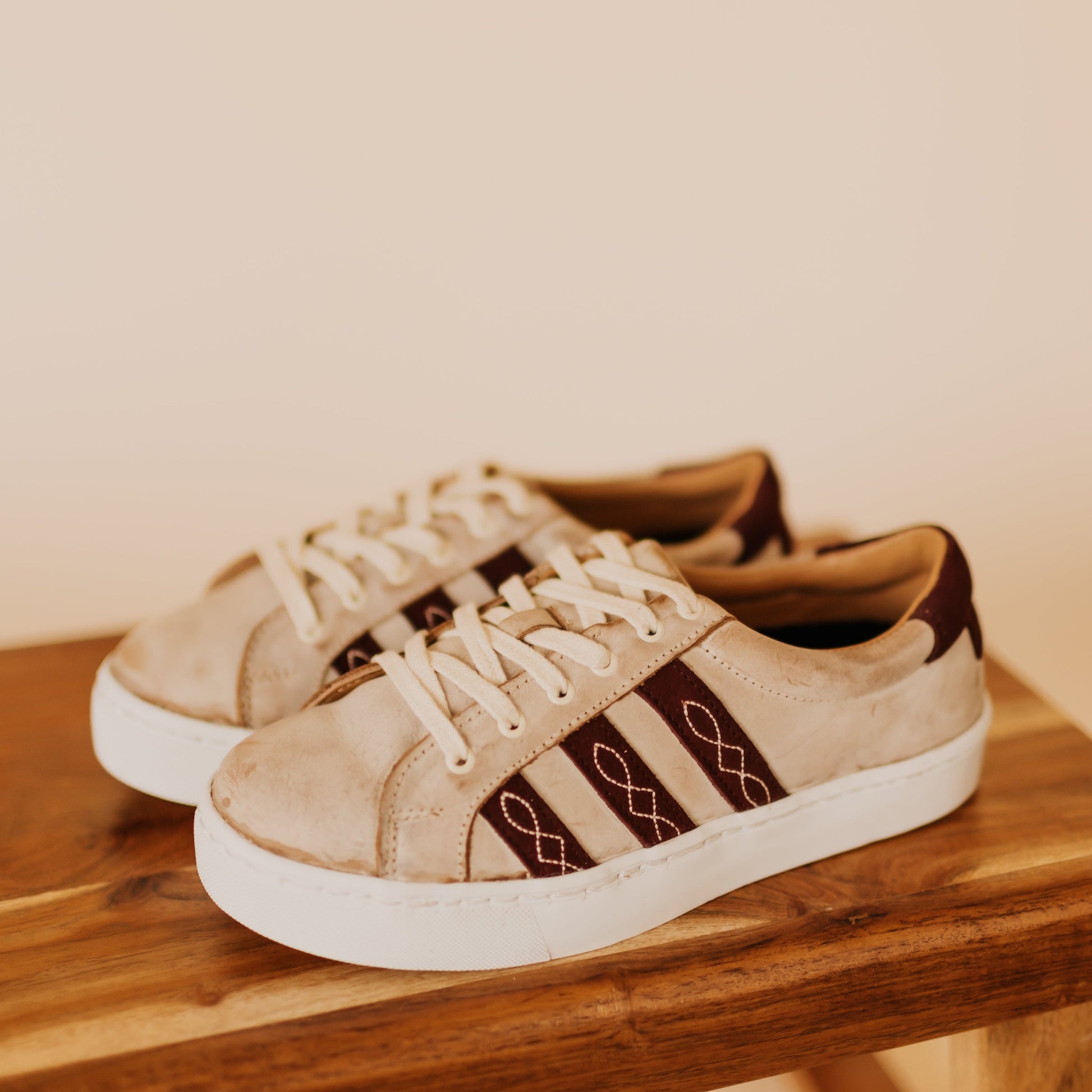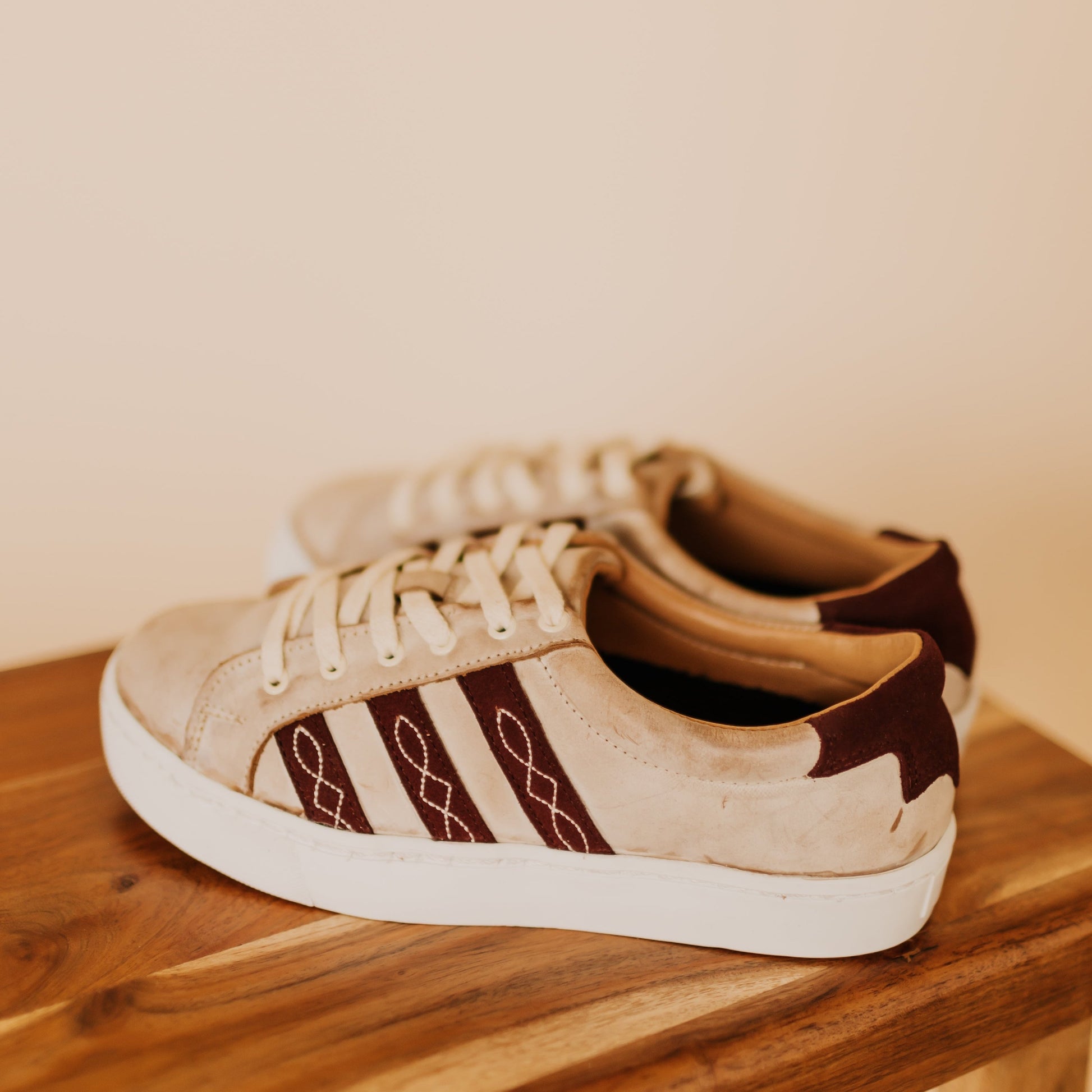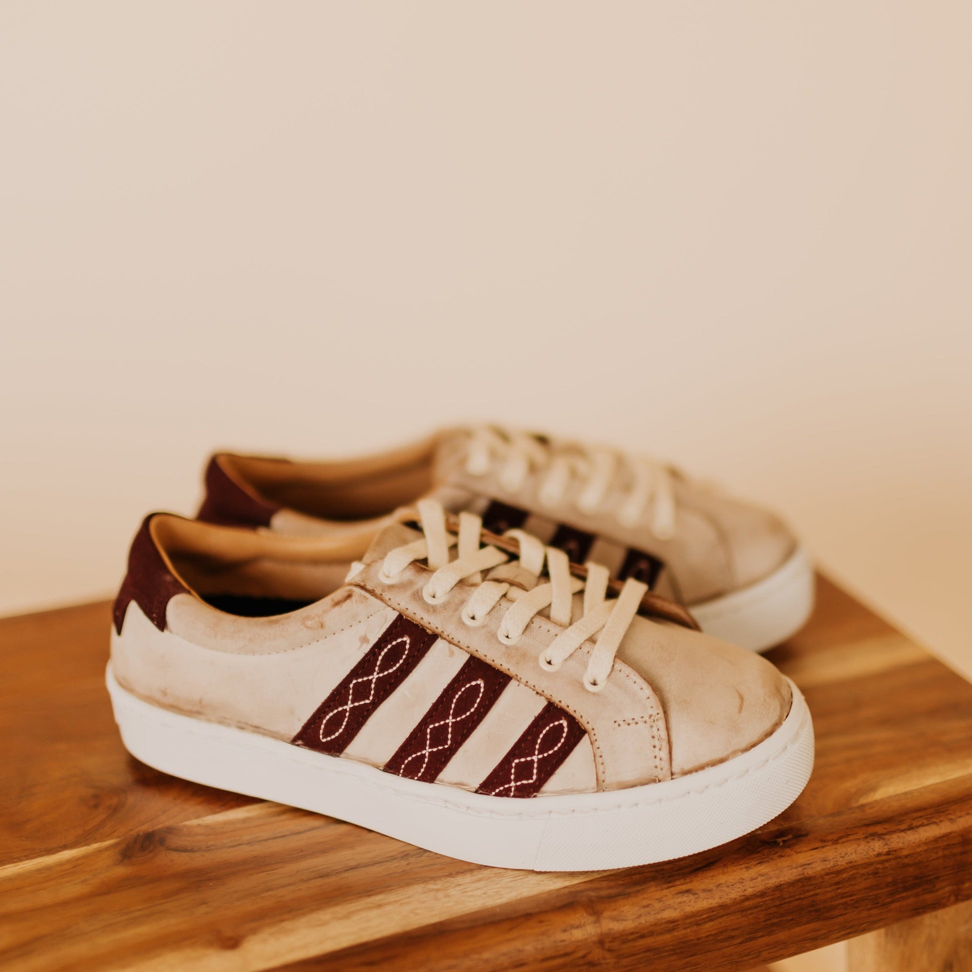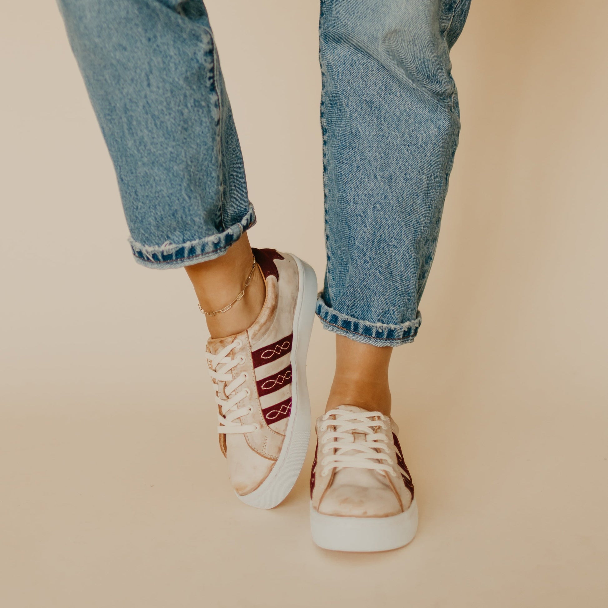 Not your usual run of the mill tennis shoe, that's for sure! Our Sheridan Game Day Tennis features distressed leather that will age and develop a natural patina with wear. That, paired with the unique western stitching on the maroon contrasting suede and these are a must-have staple for the fashion-forward western enthusiast.