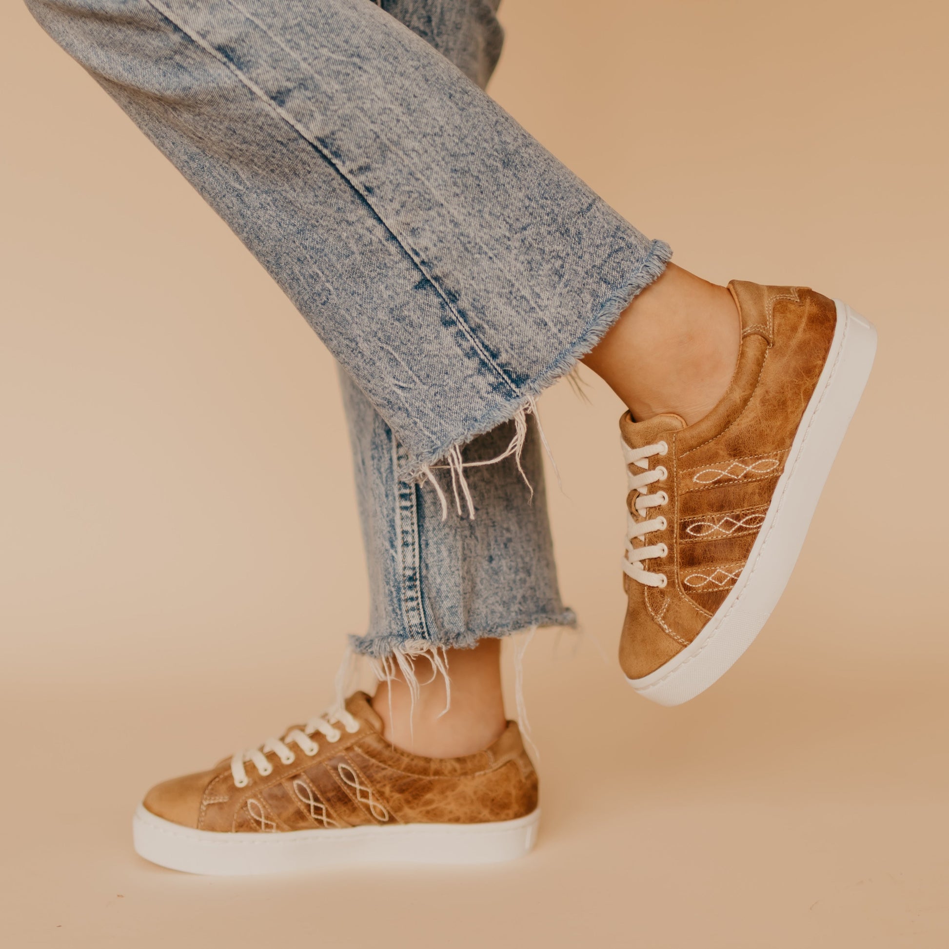 Not your usual run of the mill tennis shoe, that's for sure! Our Sheridan Olden Tan Tennis are a take off of our original Sheridan's featuring a tan distressed leather with cream stitching and cream laces. Highlighting the same unique western stitching on the side, these are a must-have staple for the fashion-forward western enthusiast.