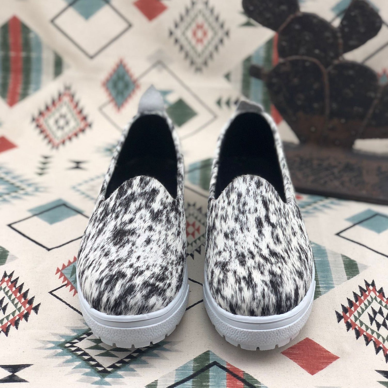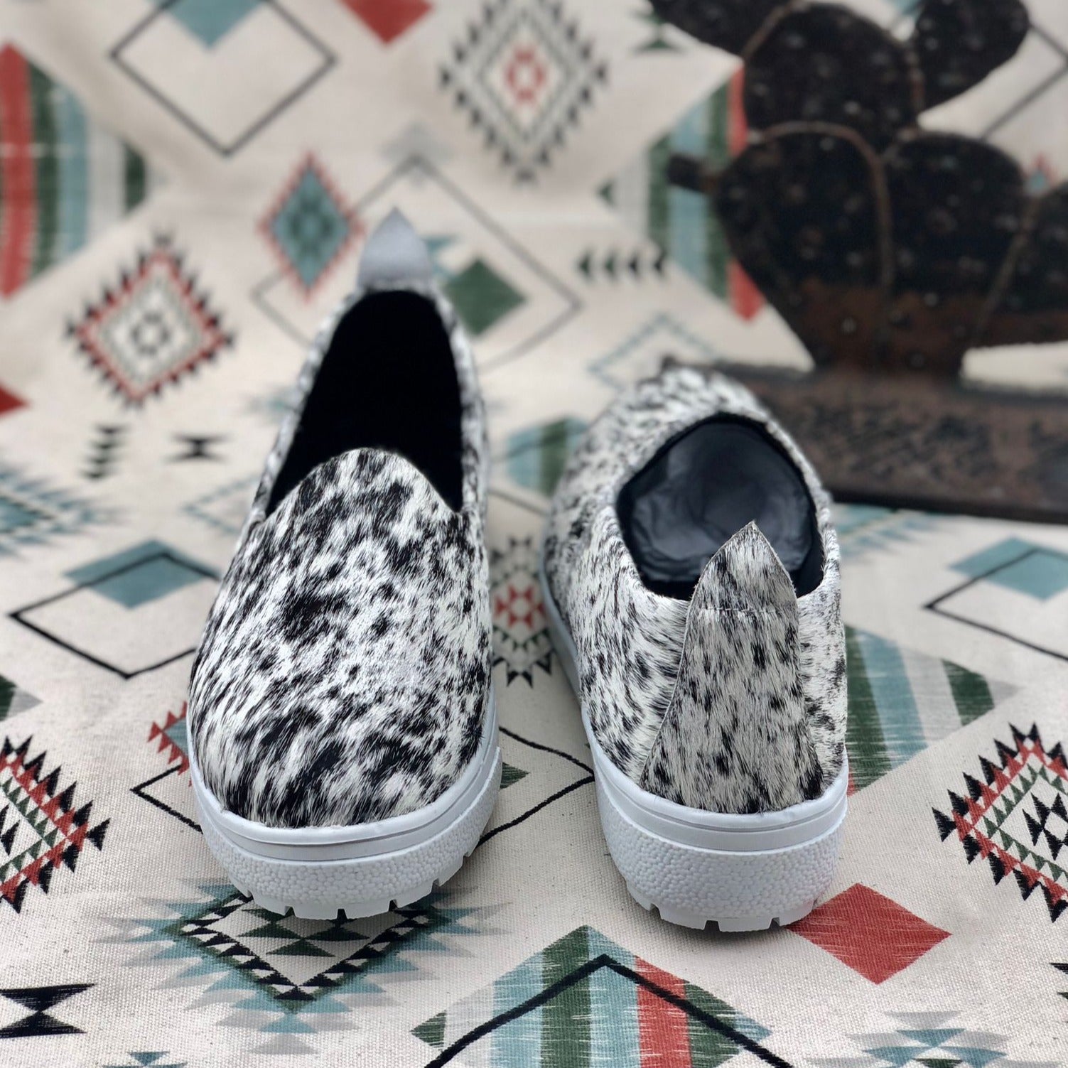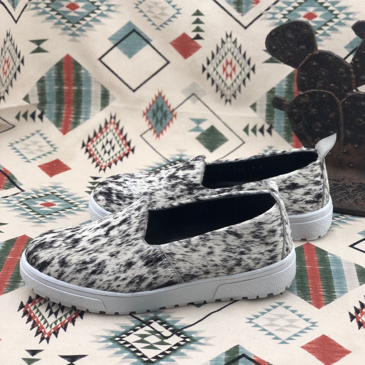 Spice up your shoe collection with these authentic, salt and pepper cowhide slip-on tennis perfect for everyday wear. Unlike anything found in stores, these are sure to turn heads and have everyone asking where you found them. Easily pair with jeans, capris, shorts, or a simple dress.